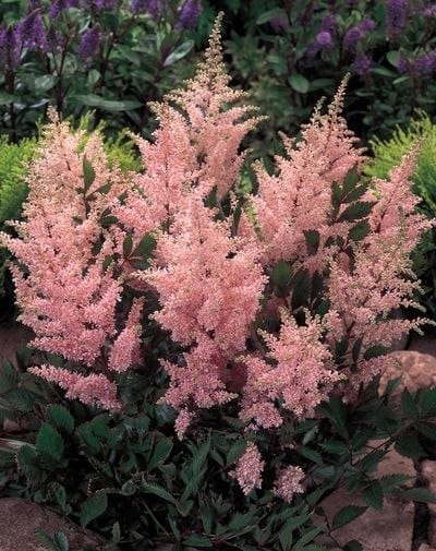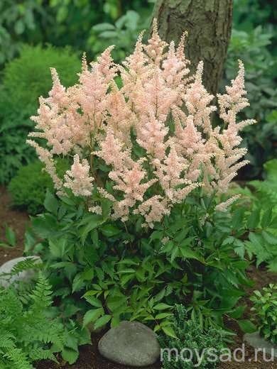 Астильба Пич Блоссом (Astilbe japonica Peach blossom) - розово-лососёвый оттенок цветов. Листва блестящая светло-зеленая/салатовый оттенок.