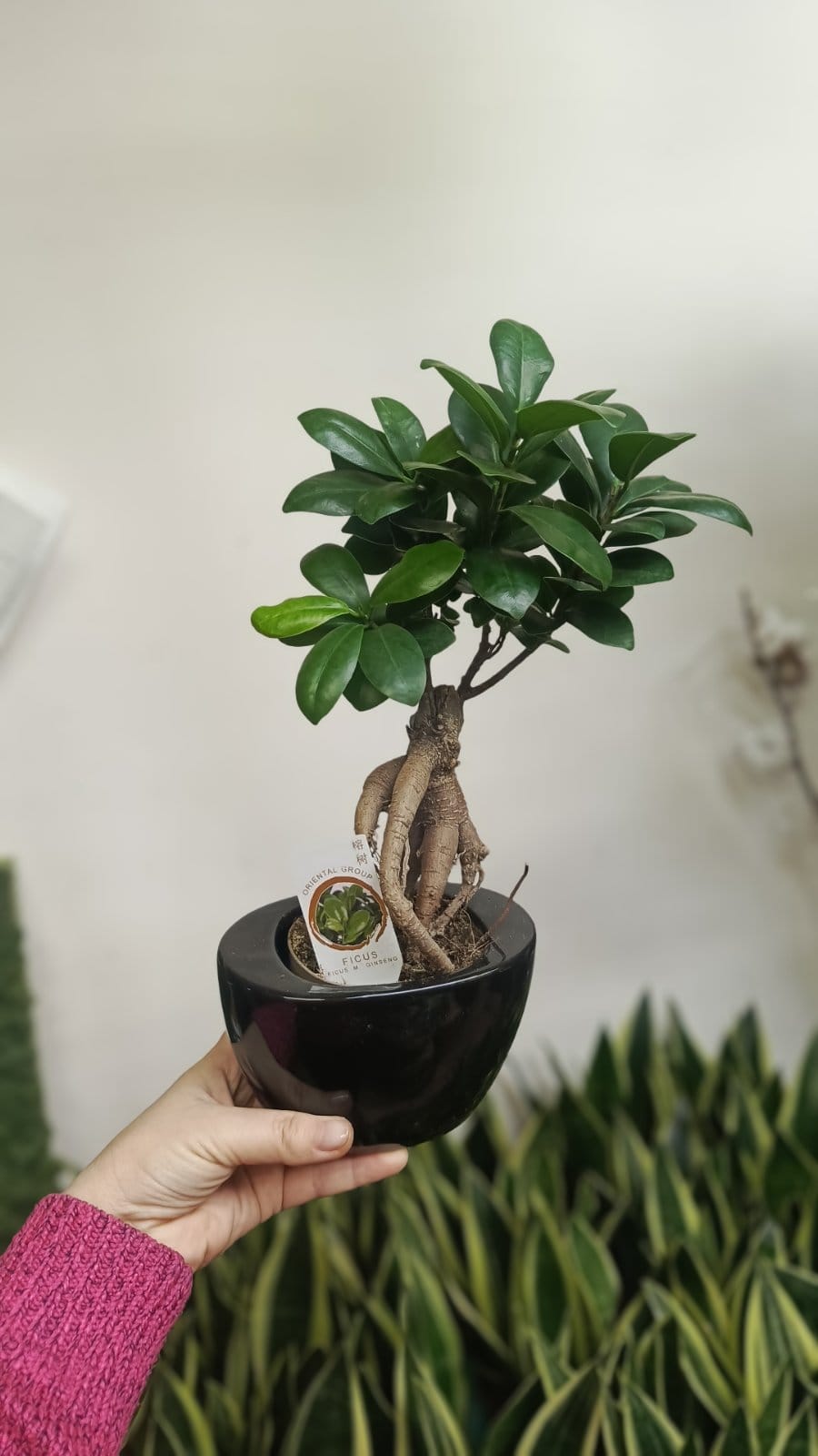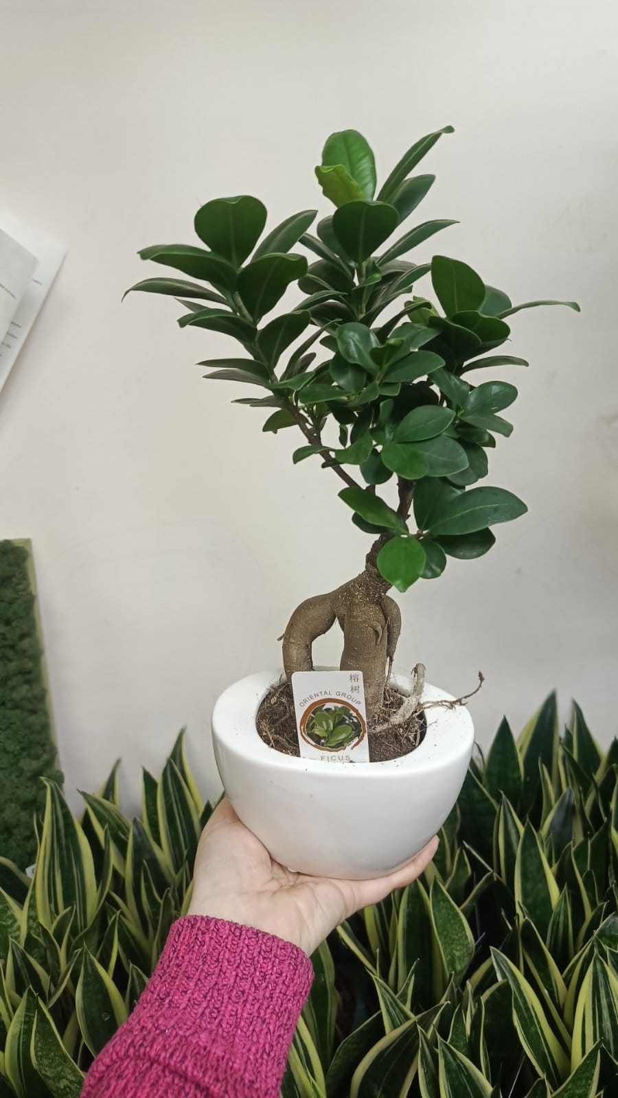 Фикус Гинсенг в керамике - это эффектное комнатное деревце в стиле бонсай в керамическом стилизованном кашпо разных расцветок: белый серый, черный.