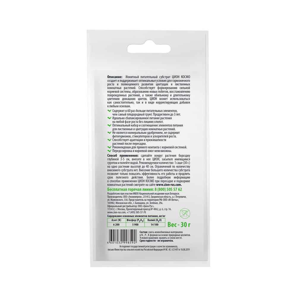 Цион КОСМО для комнатных растений - универсальное удобрение добавка для грунта в контейнере саше-пробник 30г.
