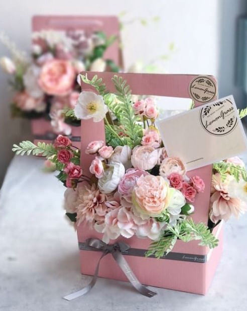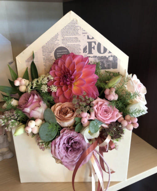 -цветочная флористическая композиция из сухоцветов и стабилизированных листьев эвкалипта и розочек, в специальной декоративной коробке в форме конверта.