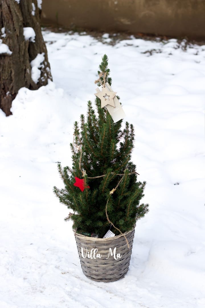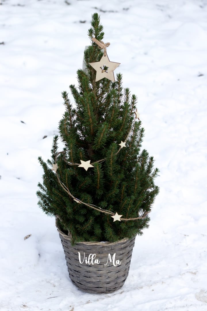 Ель Коника December /conica/ в корзине с декором - новогодняя ёлочка в горшке и в декоративной корзине из лозы серого цвета, украшенная гирляндой со светодиодами (батарейки CR в комплекте) и натуральным деревянным декором.