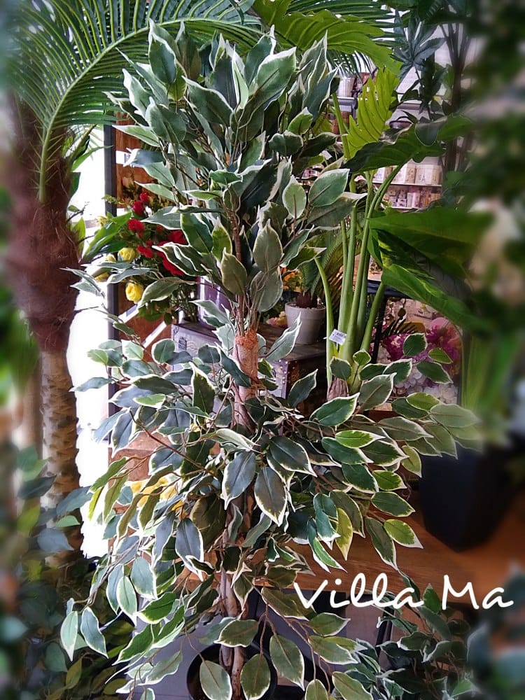 Пёстрый фикус бенжамина- копия настоящего вариегатного фикуса бенжамина Анастасия в чёрном пластиковом горшке.