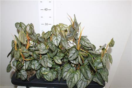 У этого вида оливково-зеленые удлиненные сердцевидные листья с серебристыми вкраплениями, которые с возрастом растения становятся более выраженные.