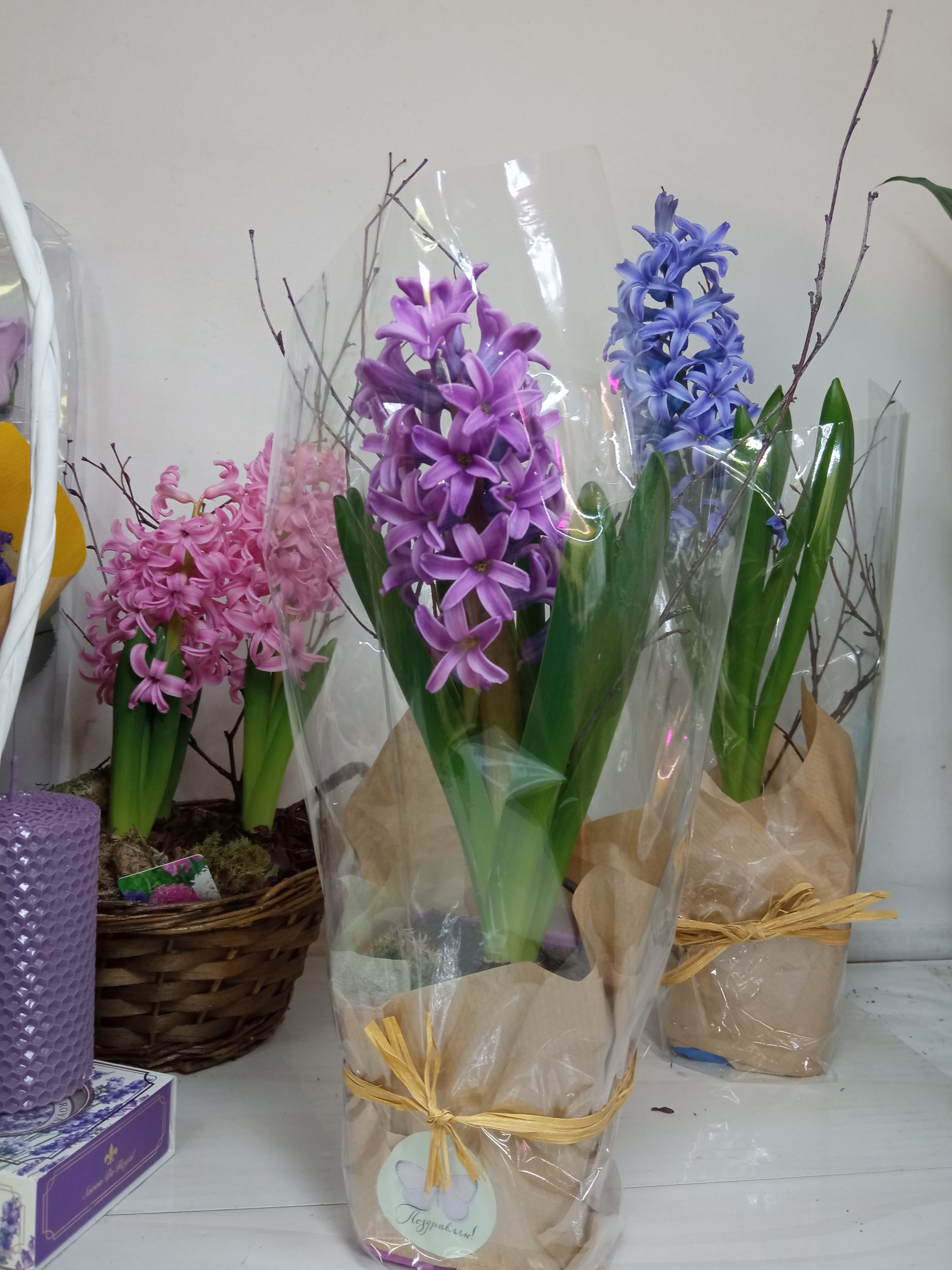 Гиацинт Принцесса горшочек во флористической упаковке -живой букетик.