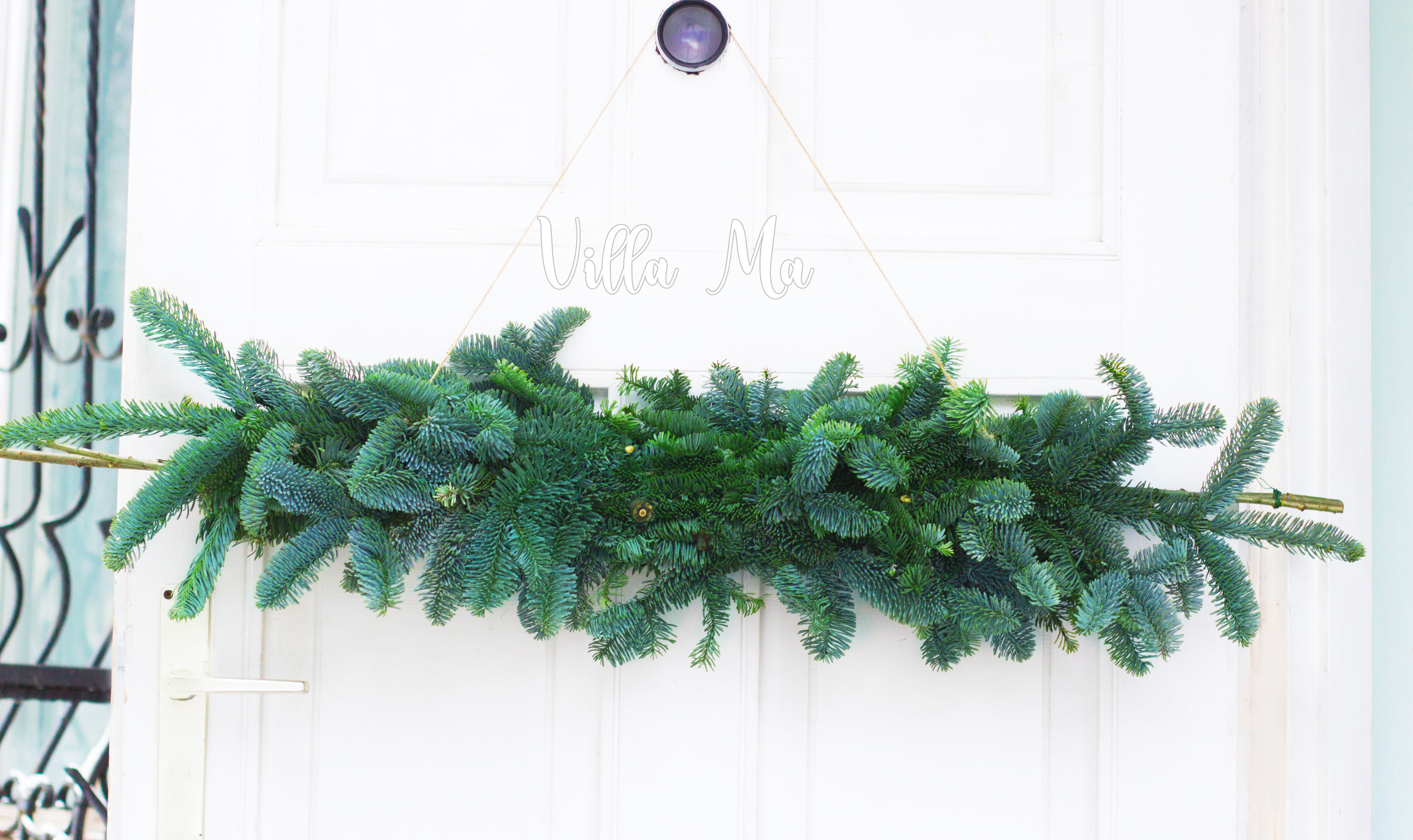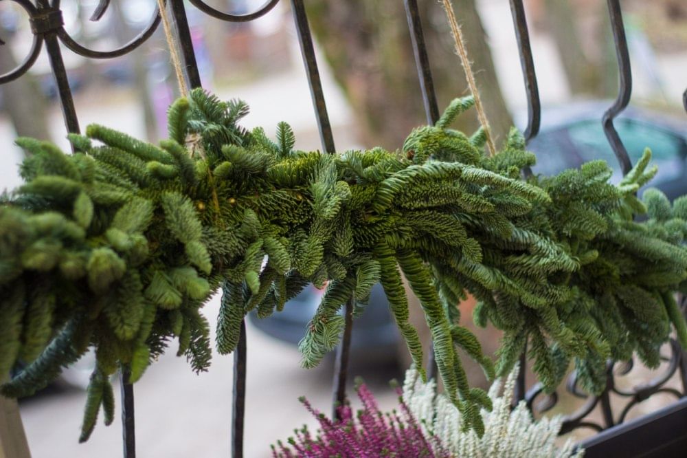 Подобная композиция , хвойная гирлянда, еловый шлейф или сваг - станет центральным украшением дома. Гирлянды из нобилиса хороши на подоконниках, окнах, дверных проёмах. Шлейф из голубой датской ели над входной дверью или перилах - уже классика рождественского декора .