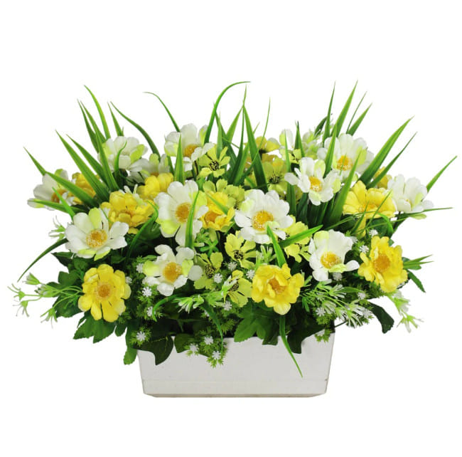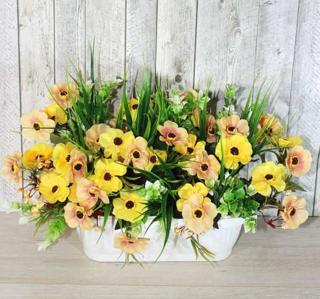 Кашпо ящик с искусственными цветами - отличное решение для входных групп, витрин и других мест, где тяжело ухаживать за живыми цветами, а цветы нужны.