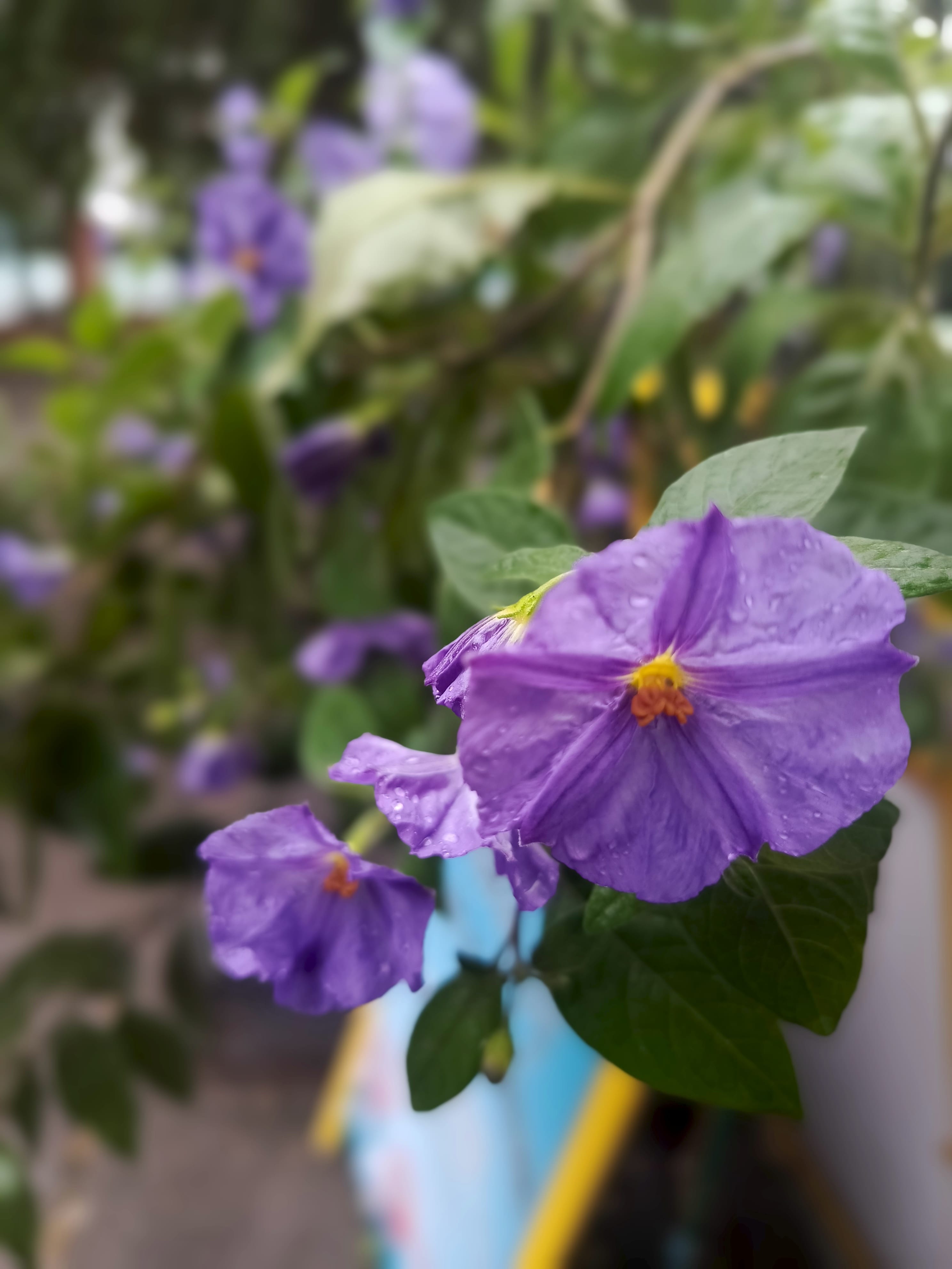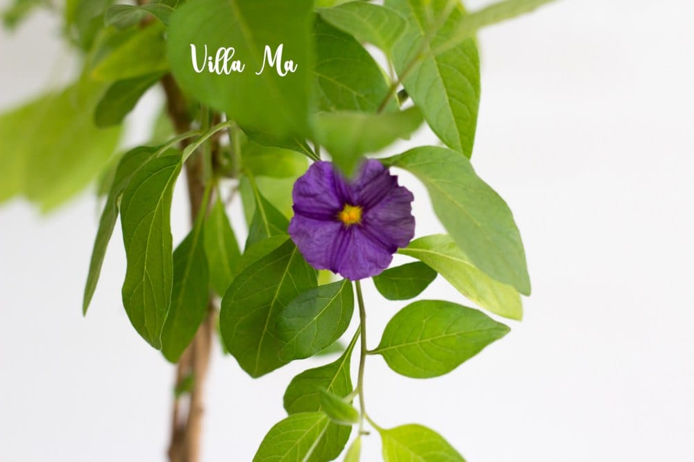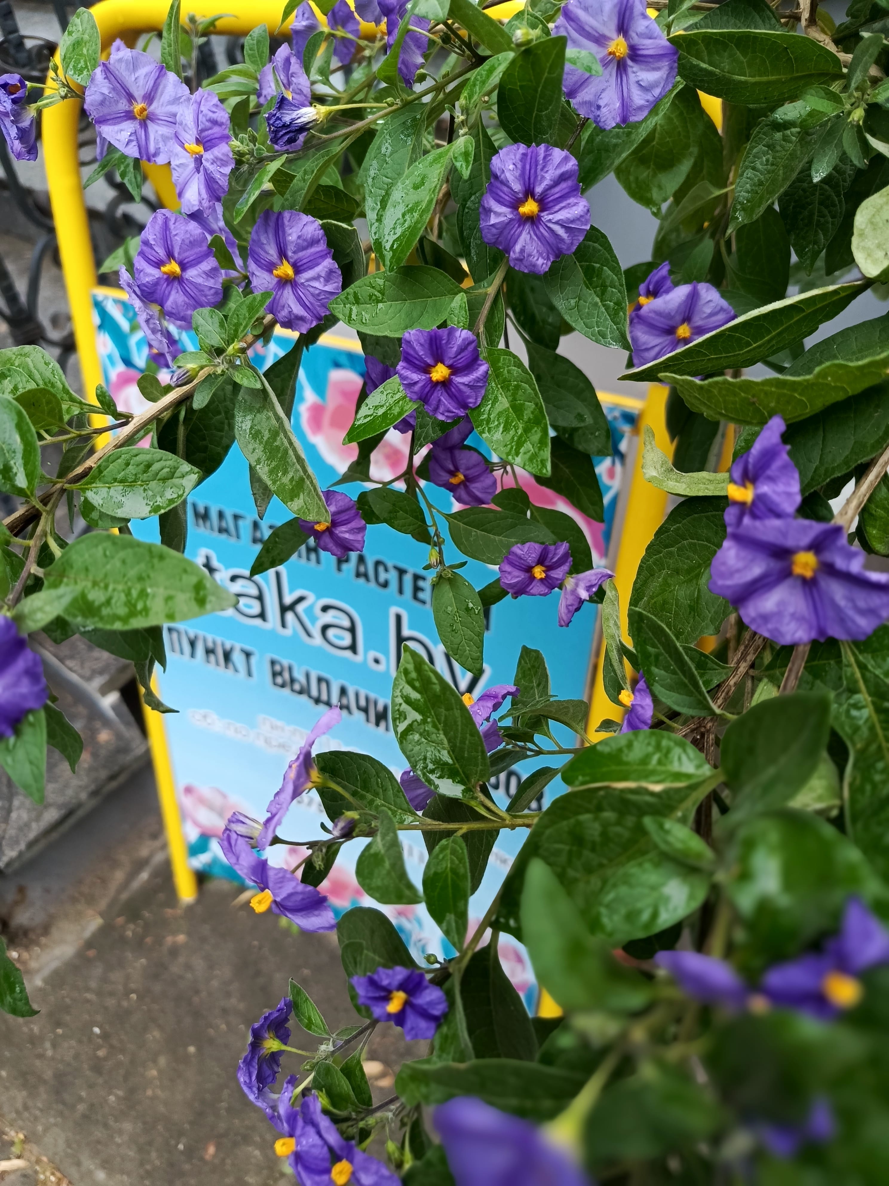 Паслён/картоф.дерево цветет яркими фиолетовыми цветами нон-стоп с мая до заморозков, и неприхотлив в уходе.
