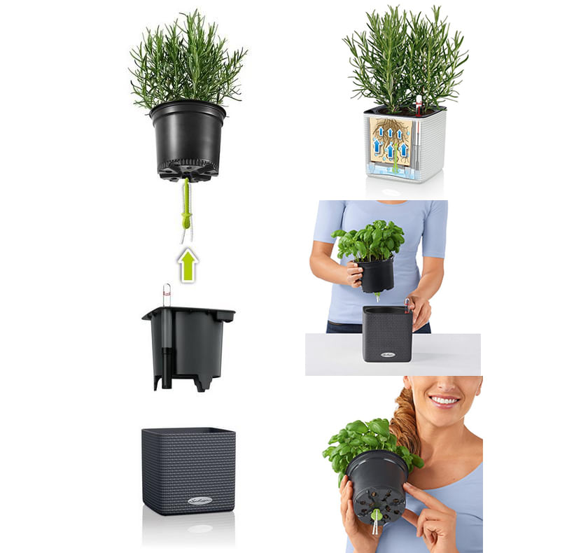 Травы даже не нужно пересаживать, так как система автополива LECHUZA надежно поставляет влагу к корням растений. Просто вставьте фитиль в родной горшок с травами, поместите его в кашпо CUBE и полейте. Готово!
