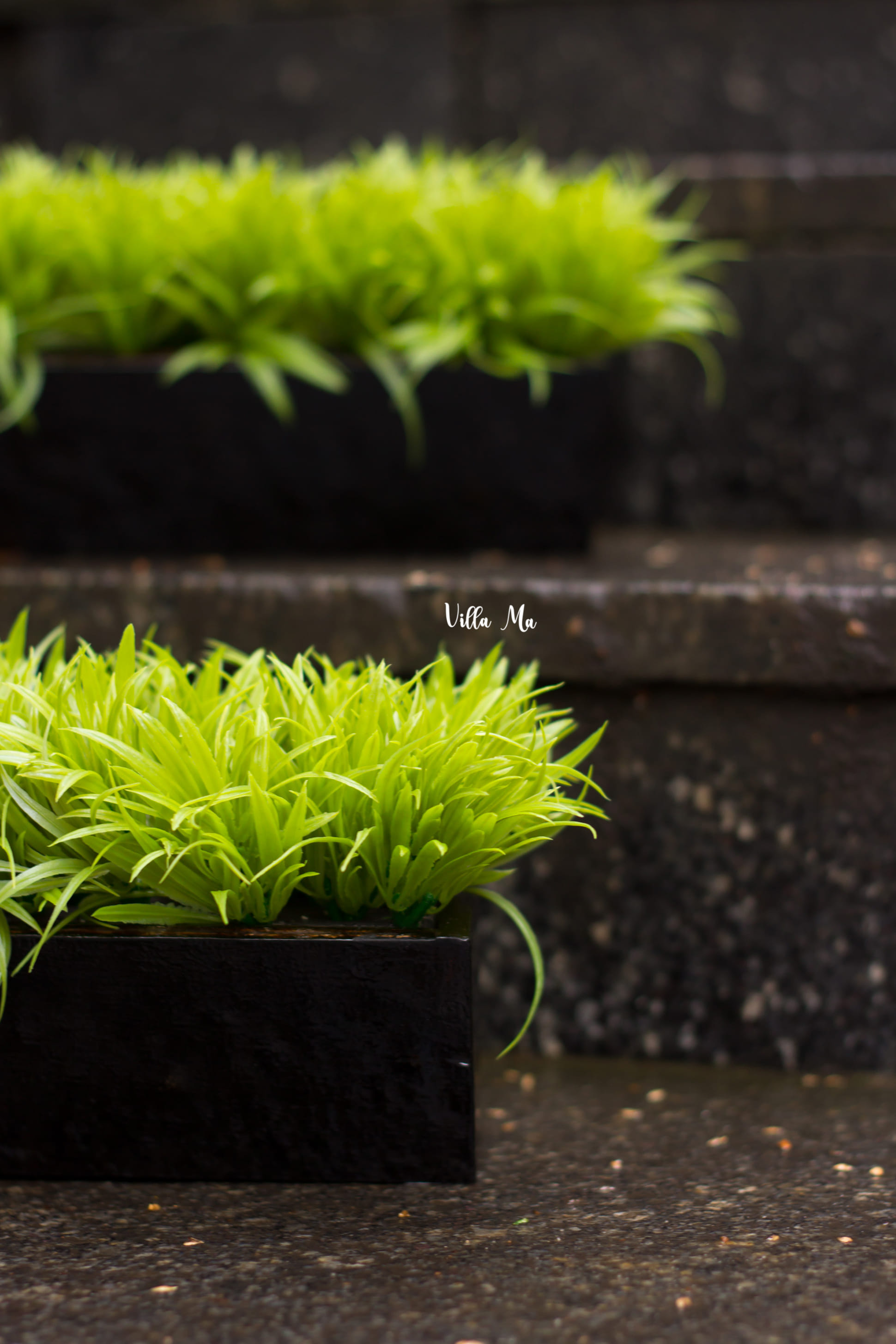 Кашпо выполнены из дерева, покрыты морилкой и лаком в несколько слоев,Трава посажена густо, плотными рядочками