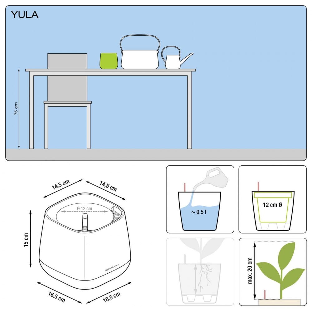 С гармоничными пастельными тонами, матовыми поверхностями и чистыми формами коллекция YULA может быть размещена в любом интерьере. Небольшие апартаменты могут быть легко украшены кашпо, вазой и другими предметами YULA. Купленные растения даже не нужно пересаживать. Они могут оставаться в своем горшке и помещены в кашпо для растений или макраме. Система автополива обеспечивает оптимальную подачу воды к корням в течение определенного периода времени. Это означает, что ручной полив больше не нужен, и ничто не препятствует поездке в отпуск или командировку, которая длится несколько дней. Просто заполните резервуар для воды, и растения будут снабжаться влагой себя в течение нескольких дней.