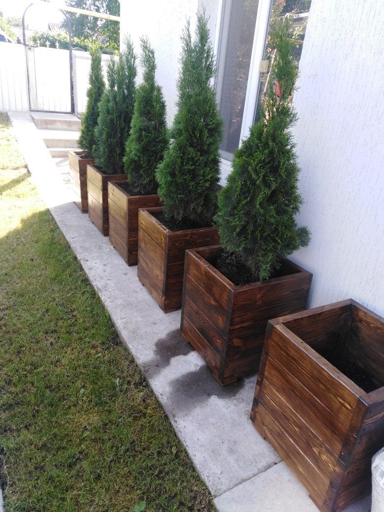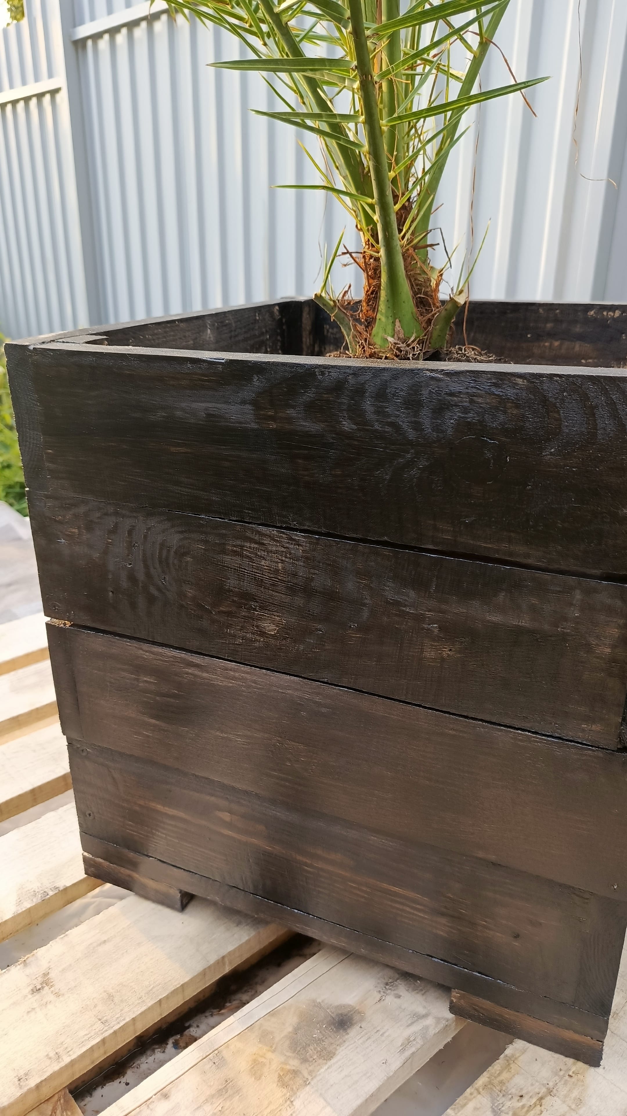 Кашпо Прованс устойчивое и тяжёлое, с защитой от влаги, предназначено для уличного озеленения. На фото расцветка лака-пропитки Палисандр, приближена к почти черному типа горький шоколад.