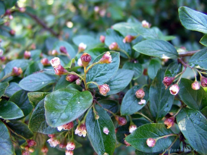 Кизильник блестящий ценится за красоту глянцевых листьев, плотный характер роста и неприхотливости. Цветет мелкими розовыми цветками в начале лета, затем созревают черные декоративные ягодки.