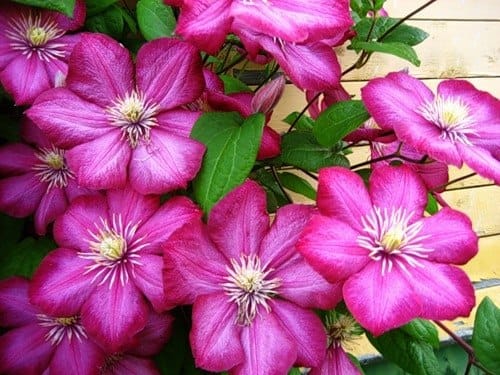 Клематис Виль де Лион (Ville de Lyon) растение лиана для вертикального уличного озеленения.