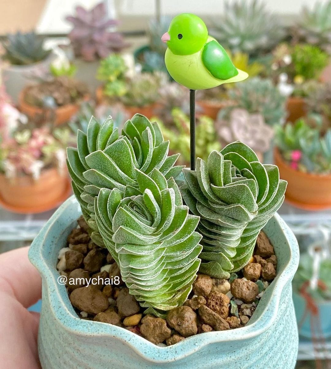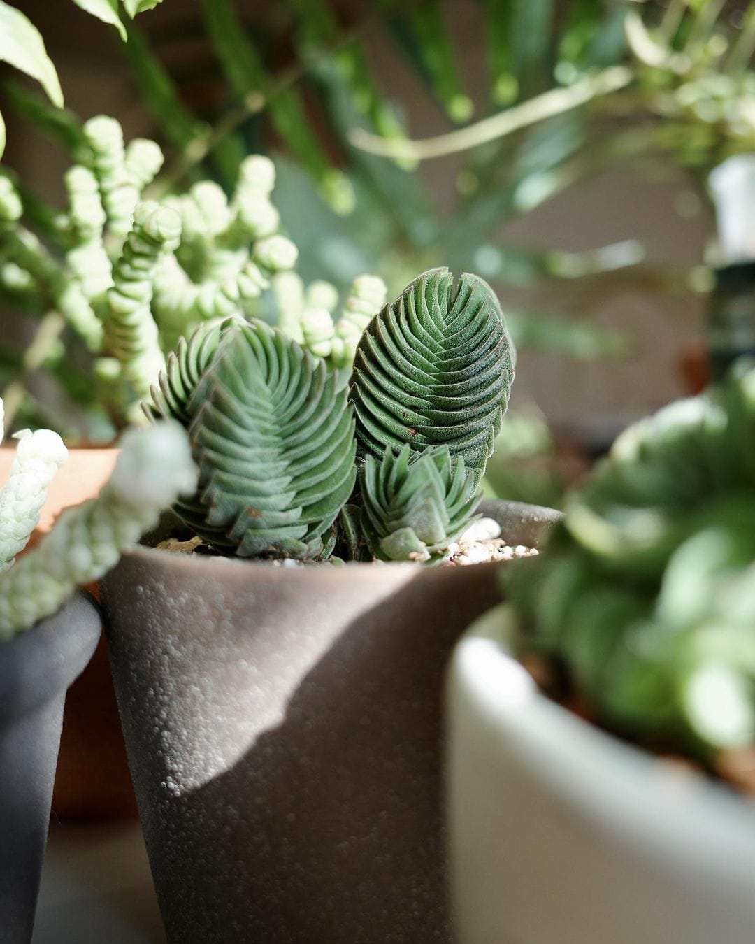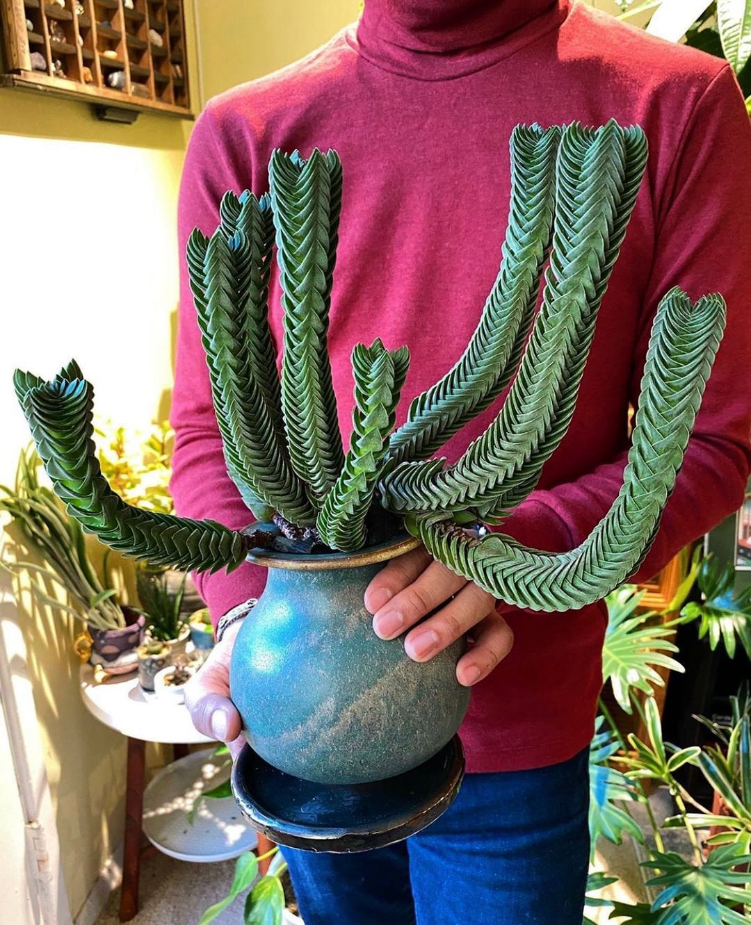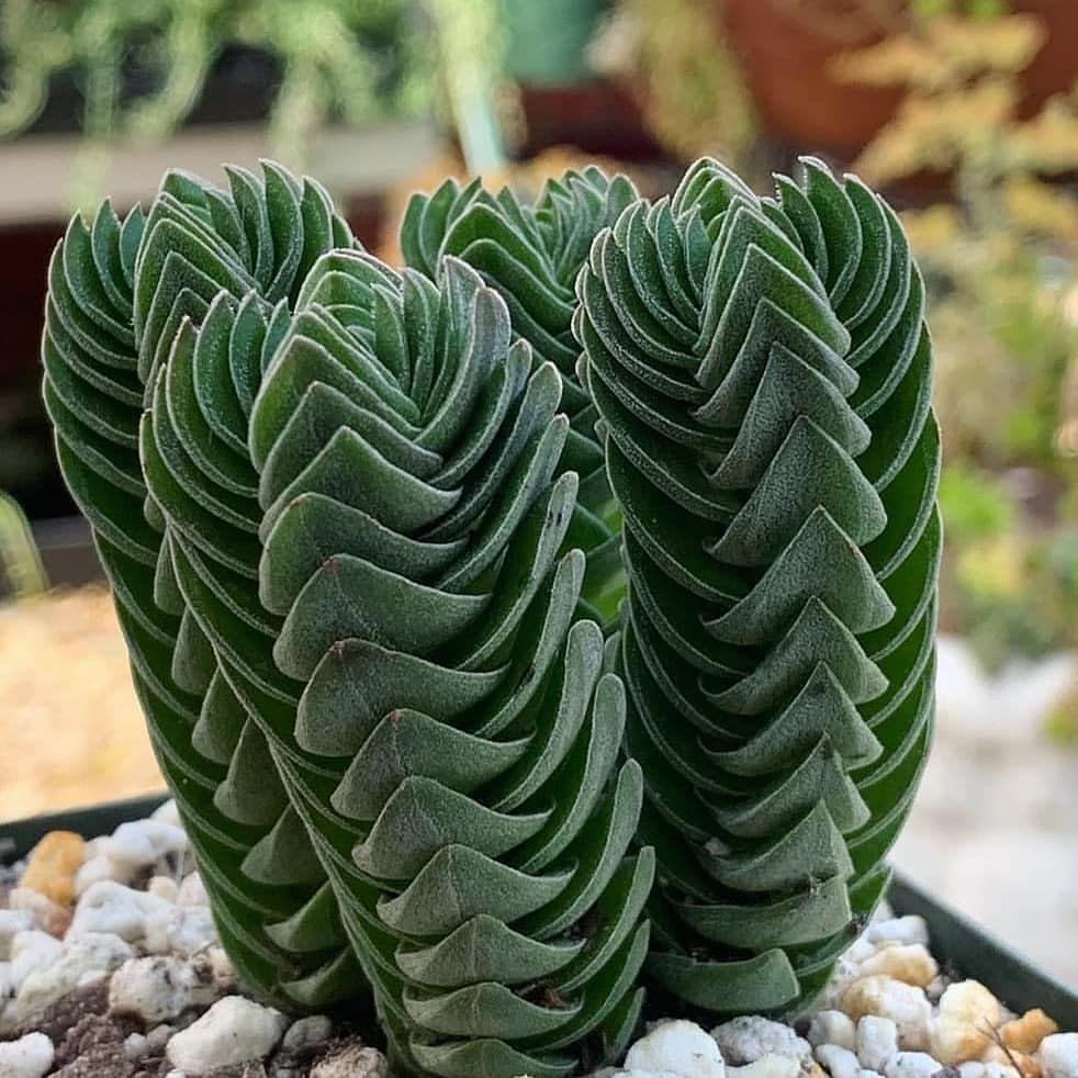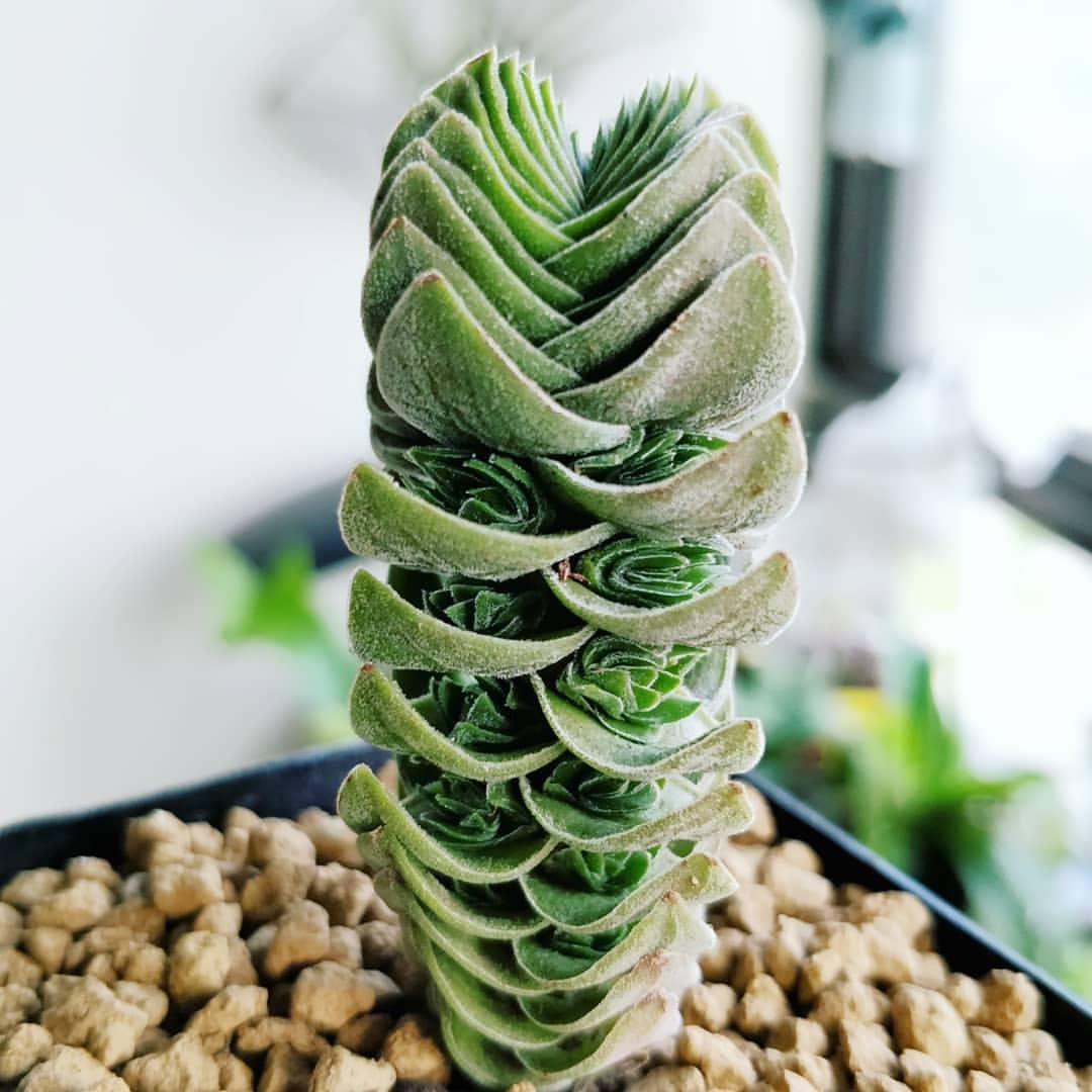 Крассула Будда Crassula ‘Buddha’s Temple’ — представитель рода Толстянок, растет прямостоячими ребристыми столбиками с изогнутыми листочками на 15 см с ежегодным приростом до 5 см. Но через 2-3 года под своим весом ложатся и растут горизонтально.