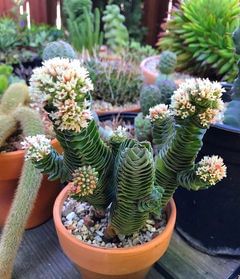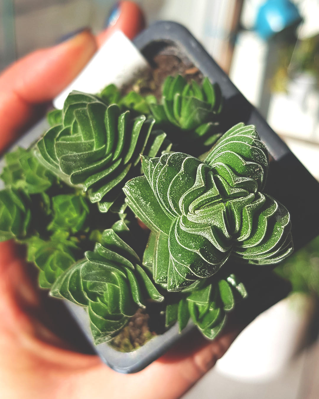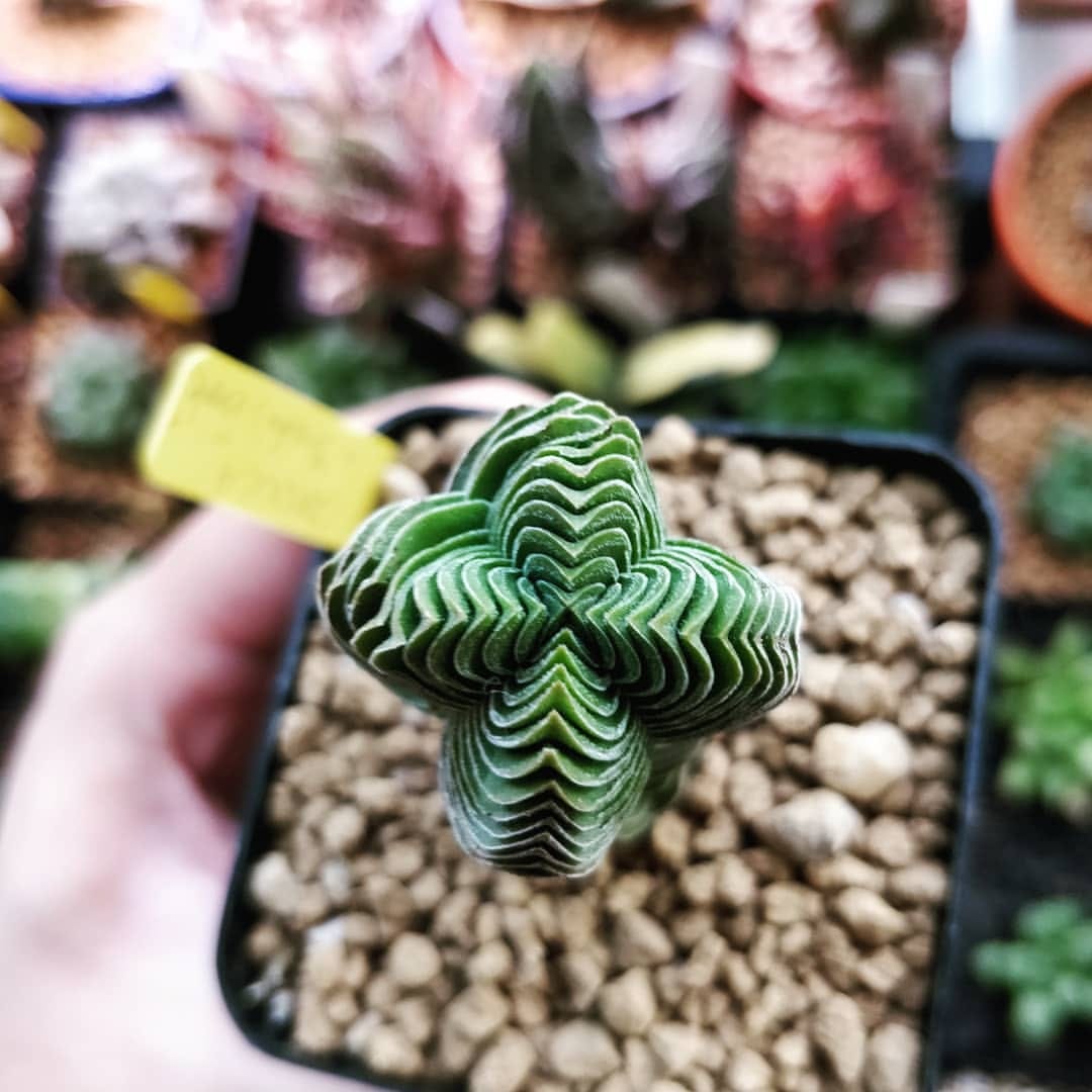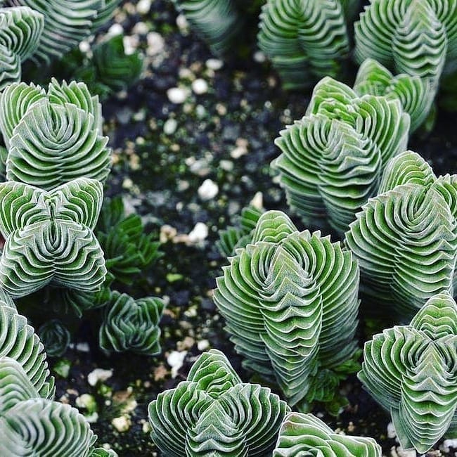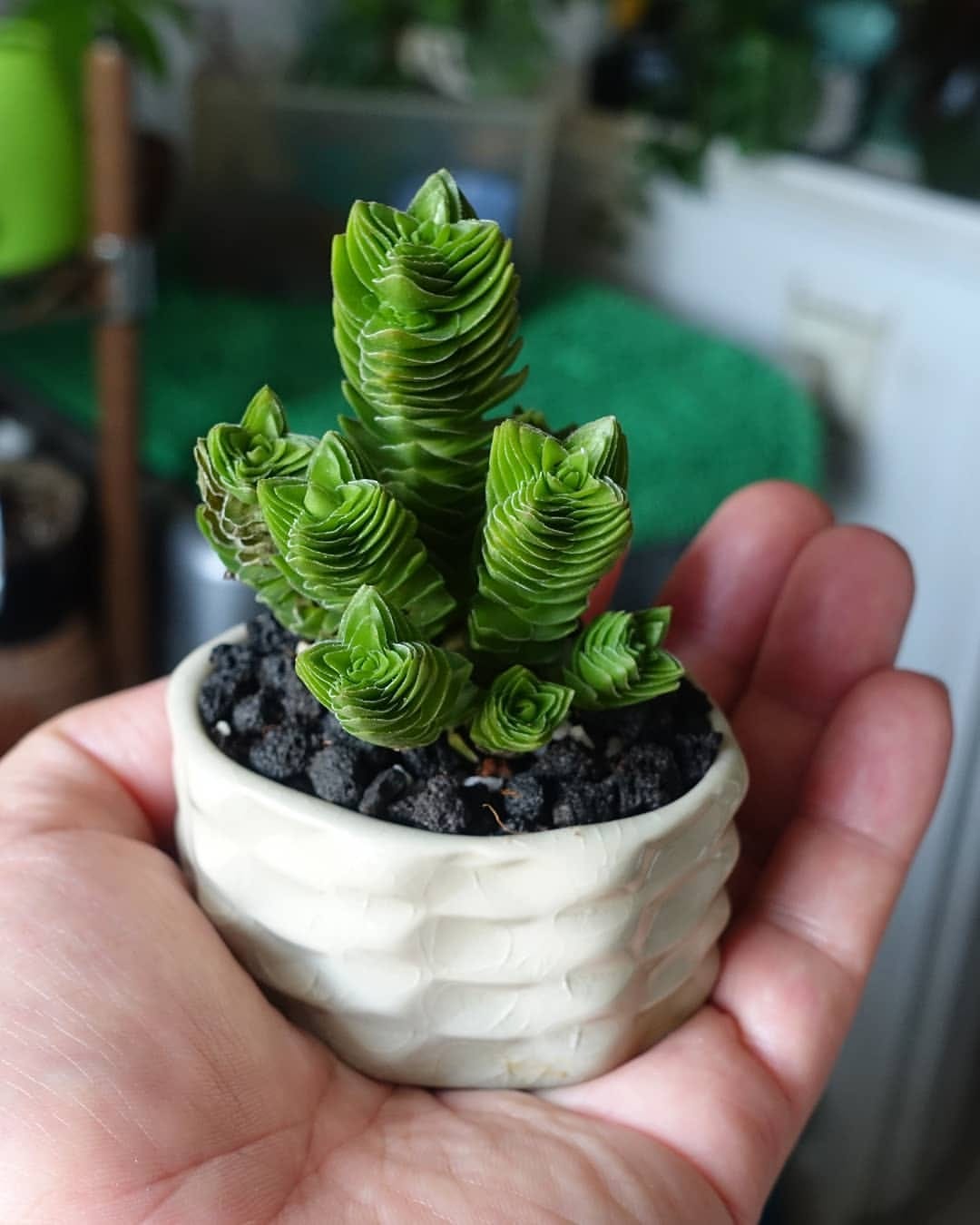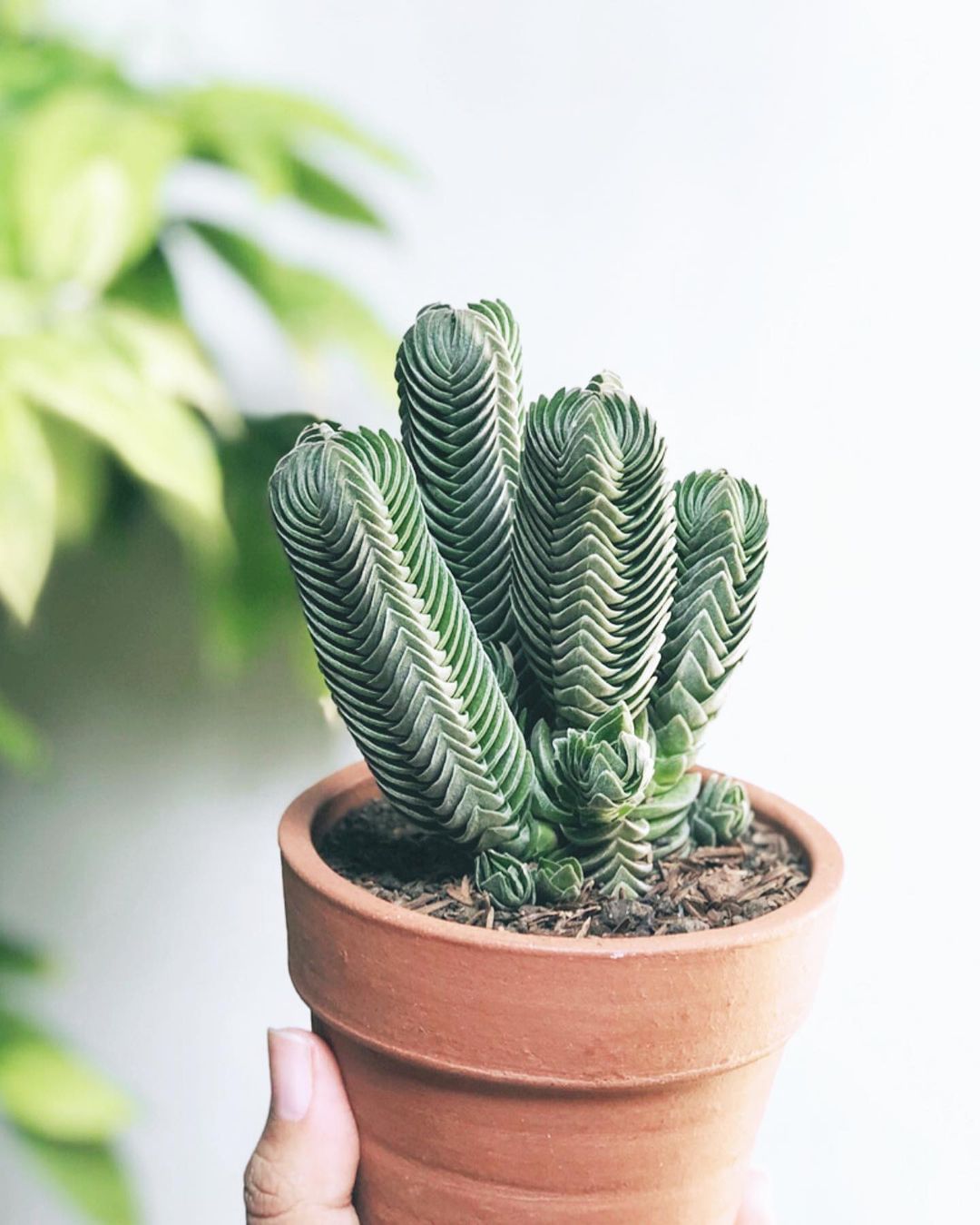 Крассула Будда Crassula ‘Buddha’s Temple’ — представитель рода Толстянок, растет прямостоячими ребристыми столбиками с изогнутыми листочками на 15 см с ежегодным приростом до 5 см. Но через 2-3 года под своим весом ложатся и растут горизонтально.