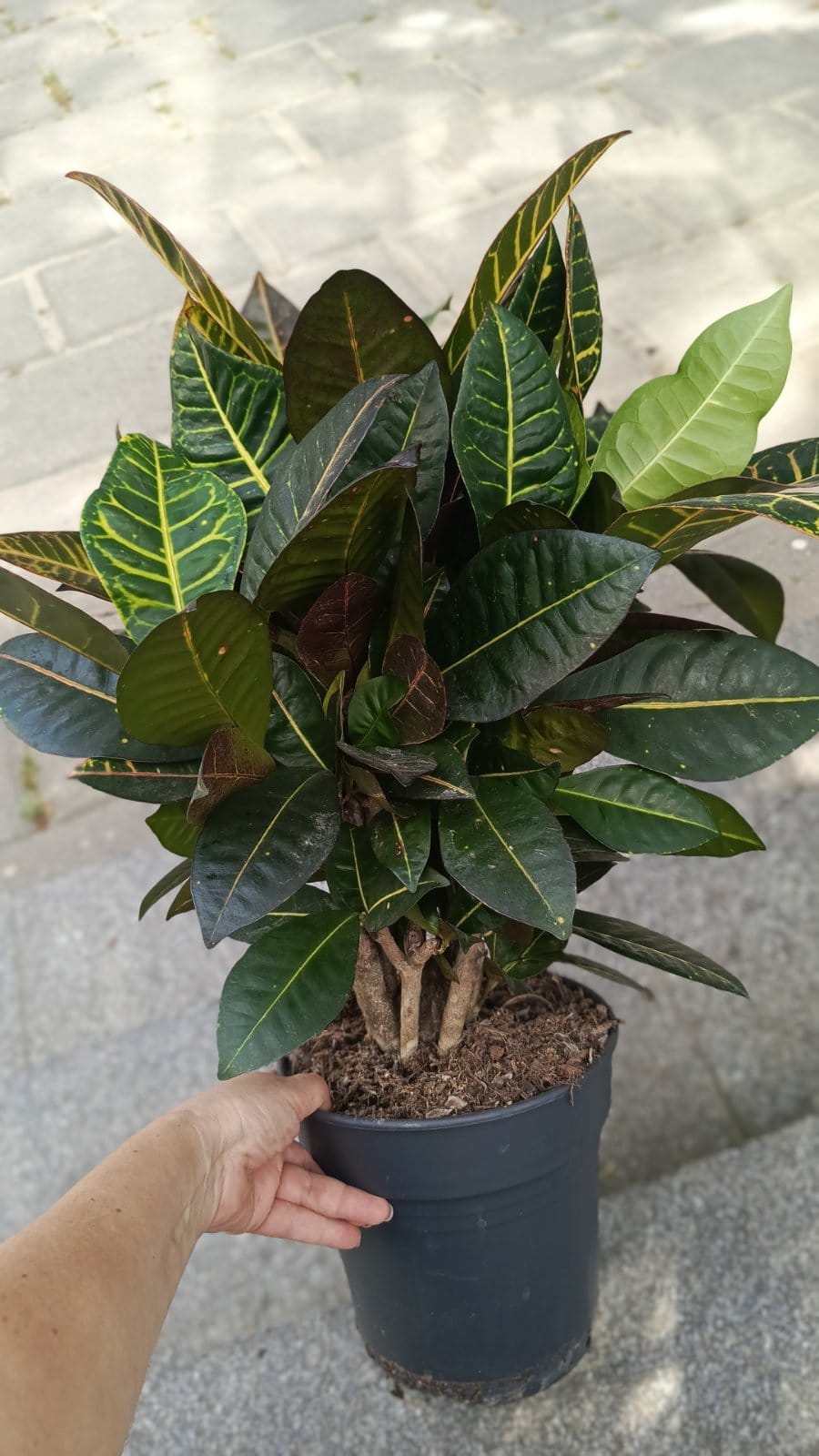 Этот кротон кодиеум Петра сформирован в виде бонсай, не высокий, но очень плотная пышная крона из множества скелетных ветвей.