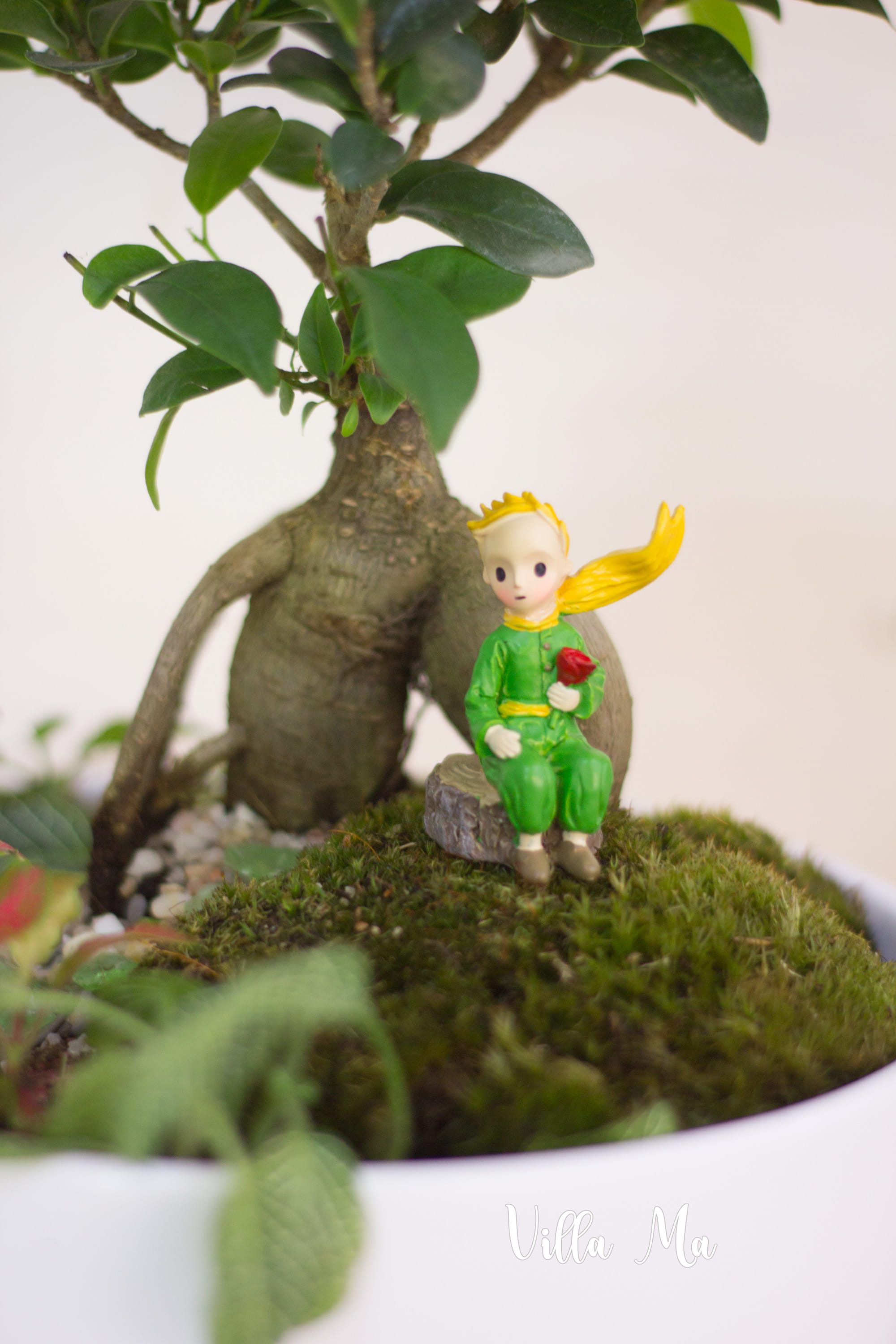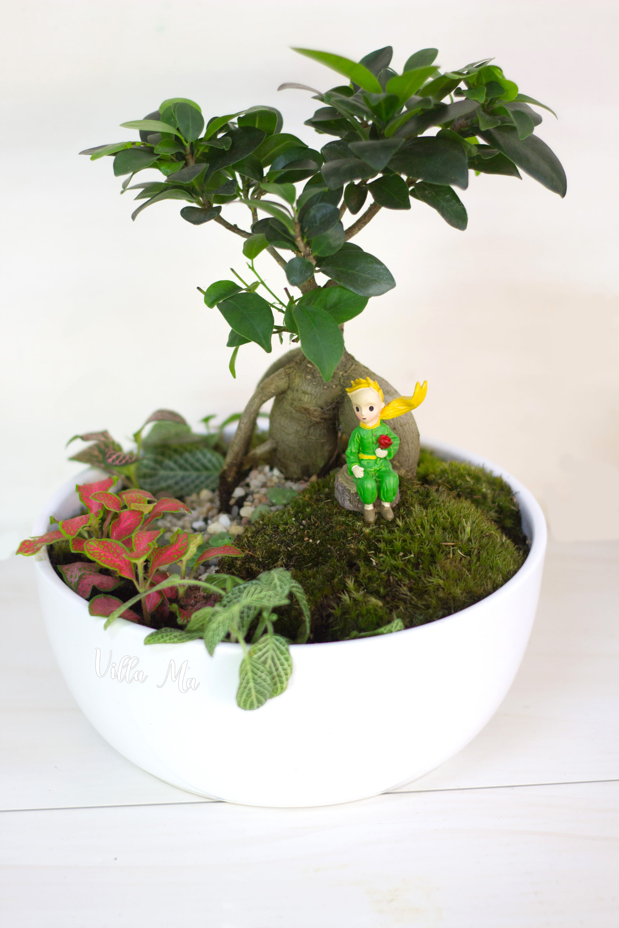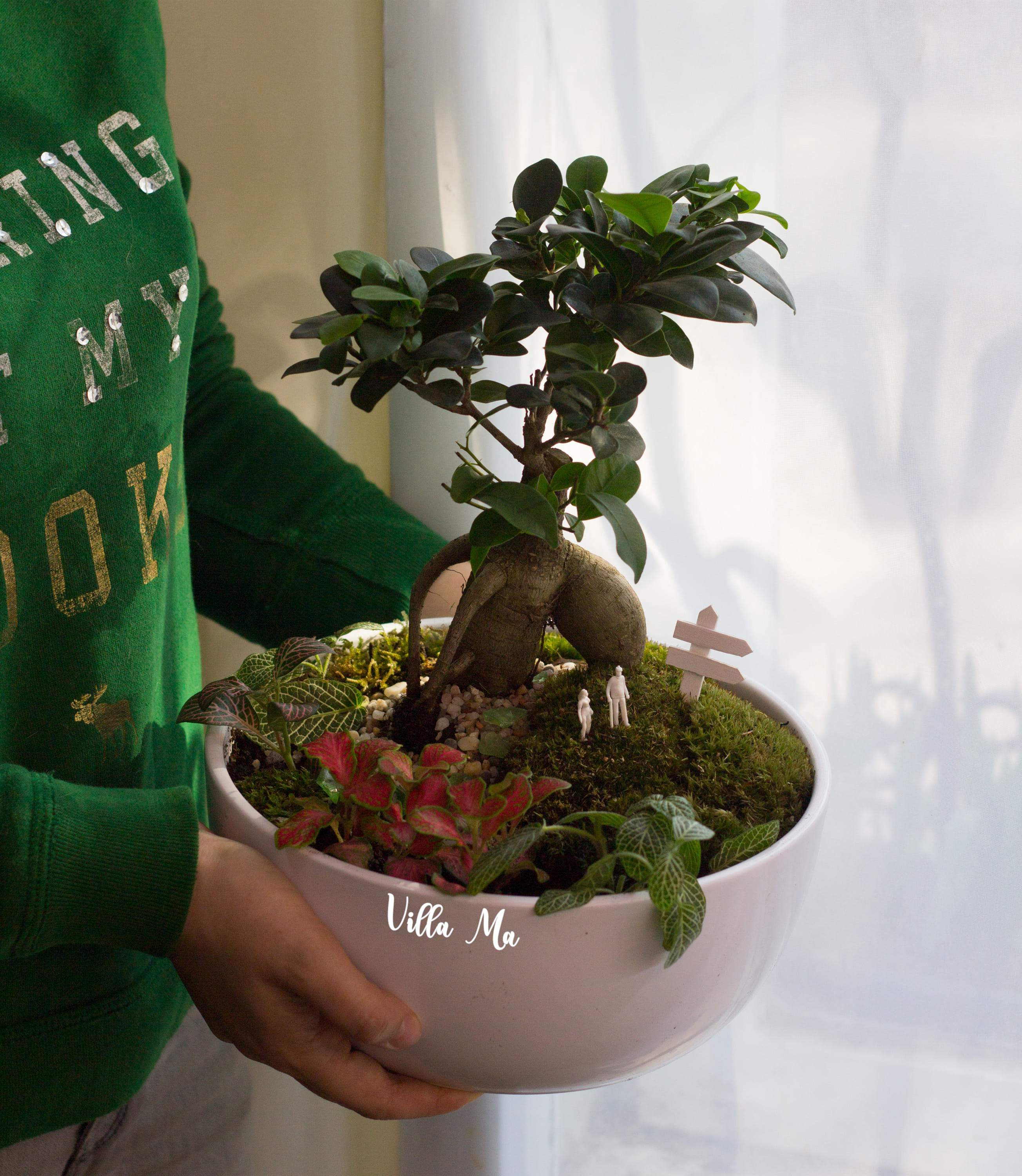 Мини садик Бонсай Фикус Микрокарпа Гинсенг (Ficus microcarpa 'Ginseng') в чаше из керамики - комнатное растение неприхотливый фикус , который выращивают как бонсай из-за свойств корней.