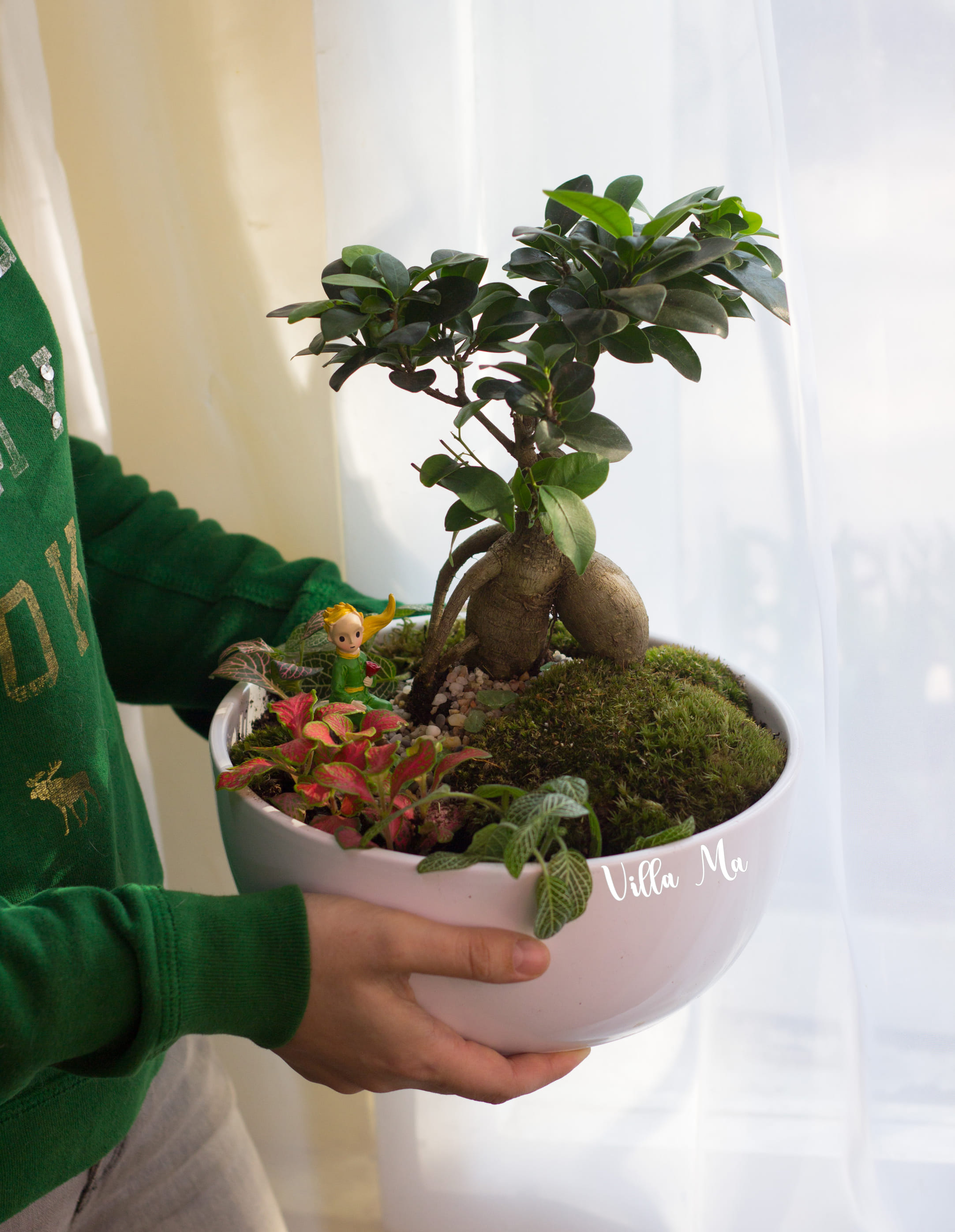 Мини Садик Бонсай Фикус Гинсенг в белой чаше из керамики