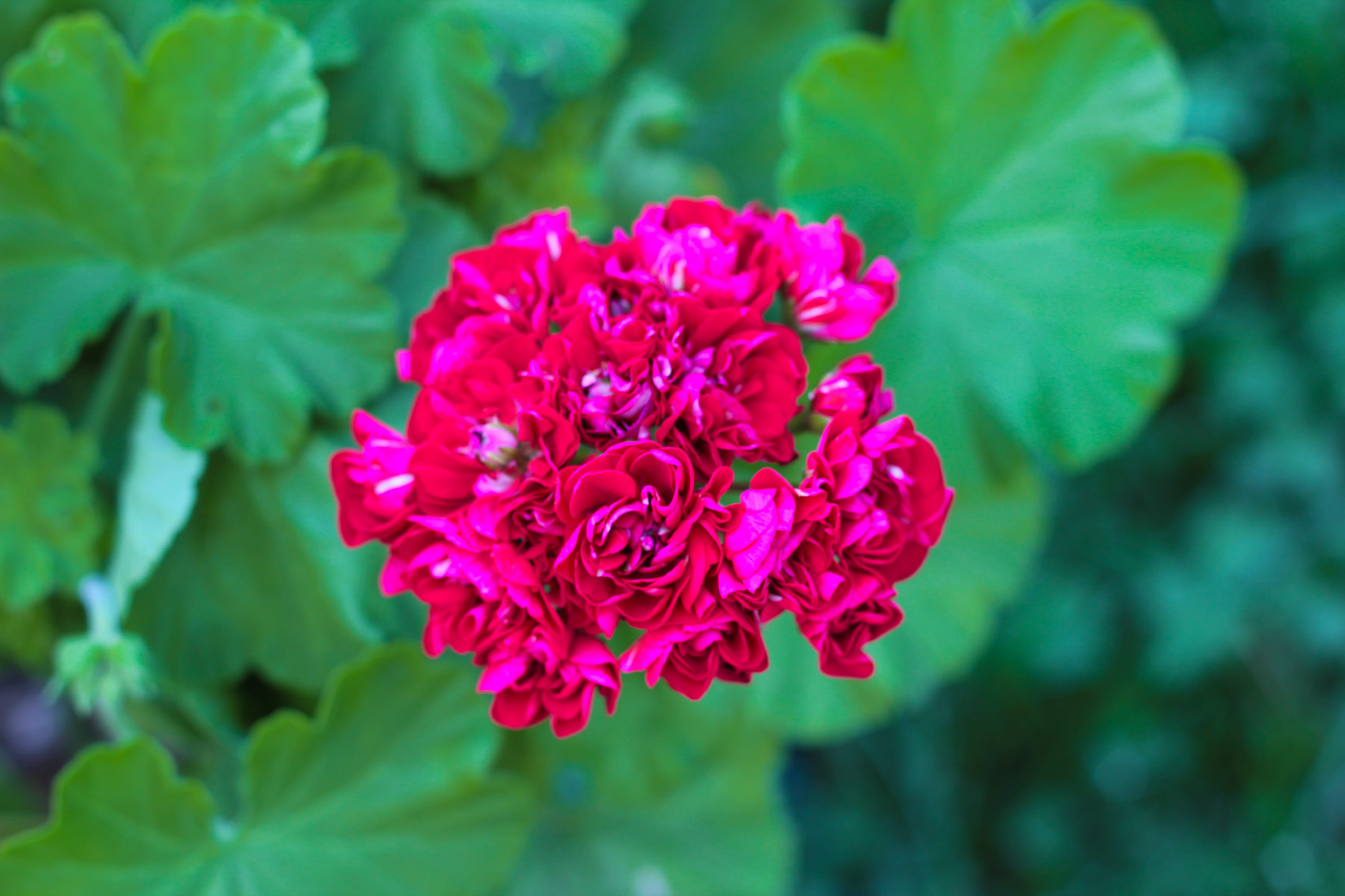 Махровые цветы-шарики темно-бордового цвета со светлой изнанкой. Зеленые листья.