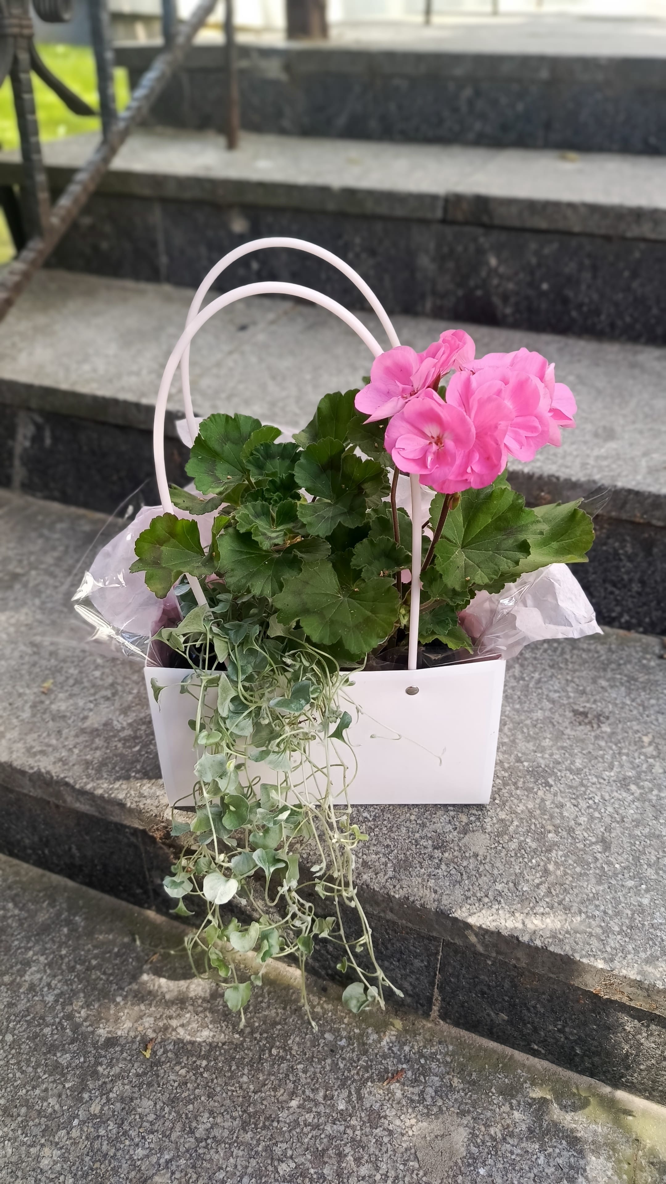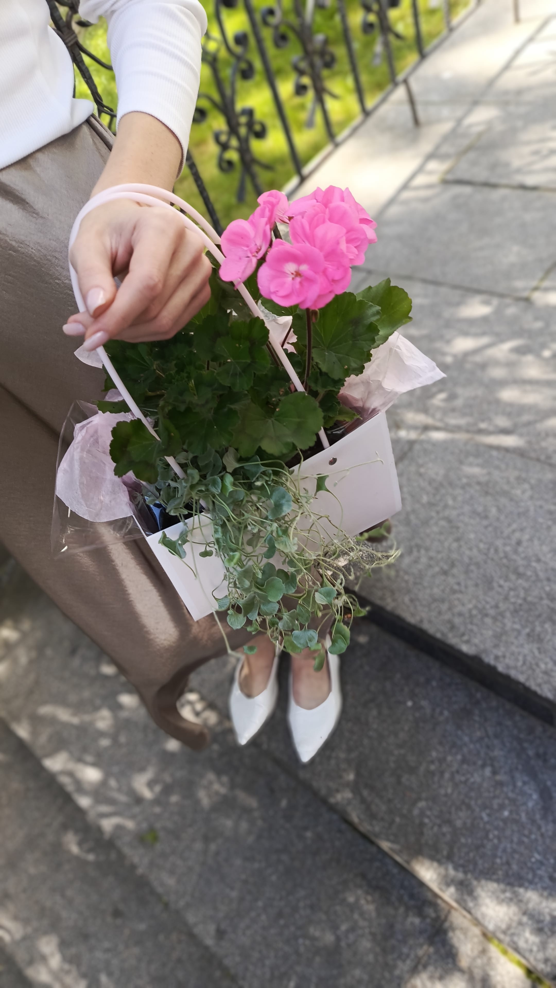 Пеларгония в сумочке - живой букет на 1 сентября.