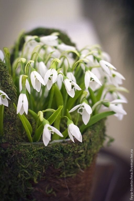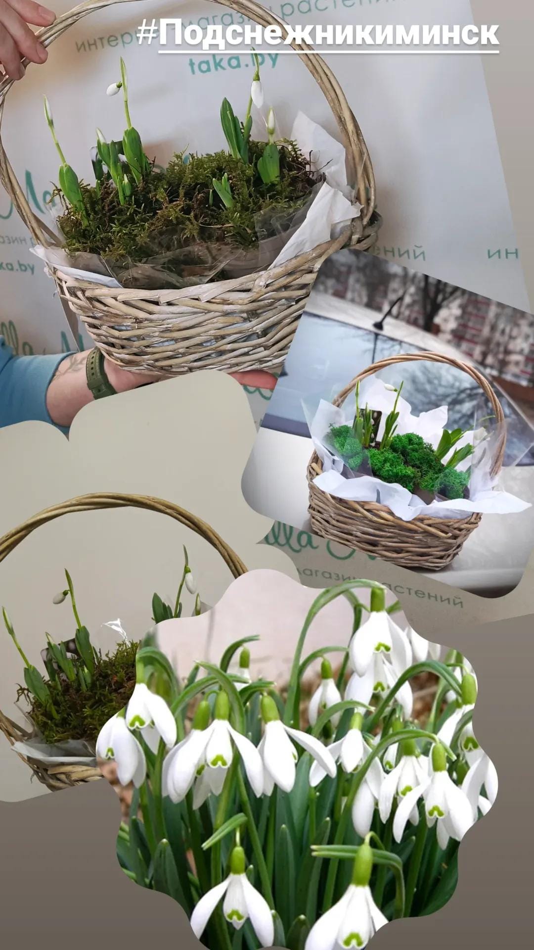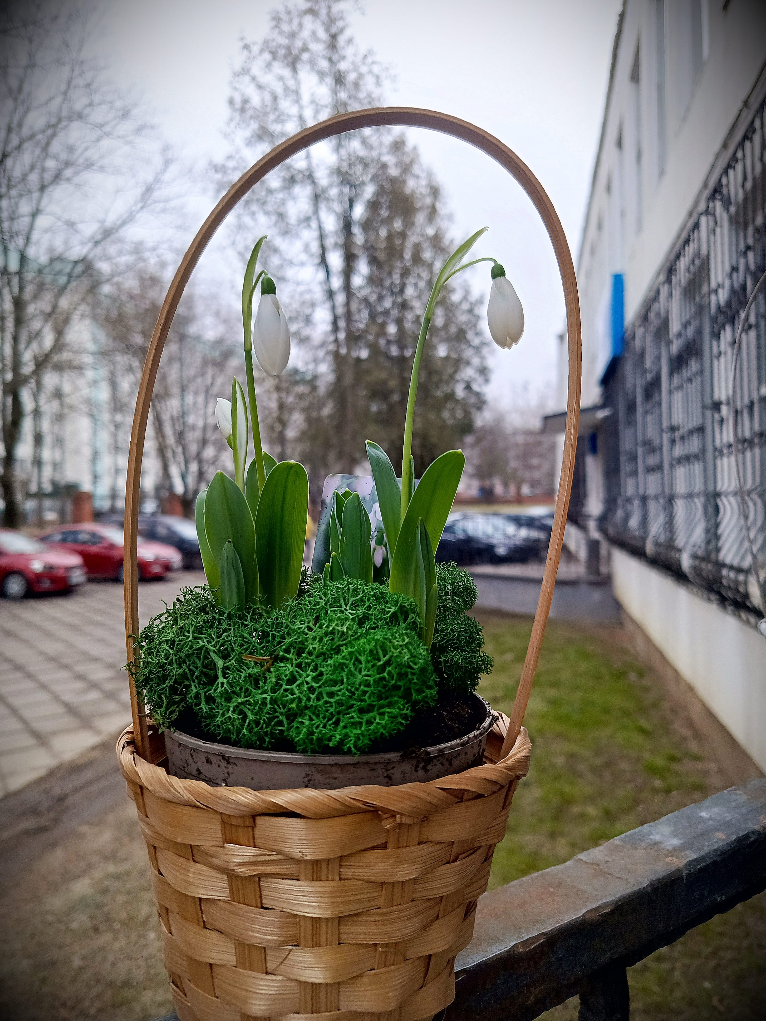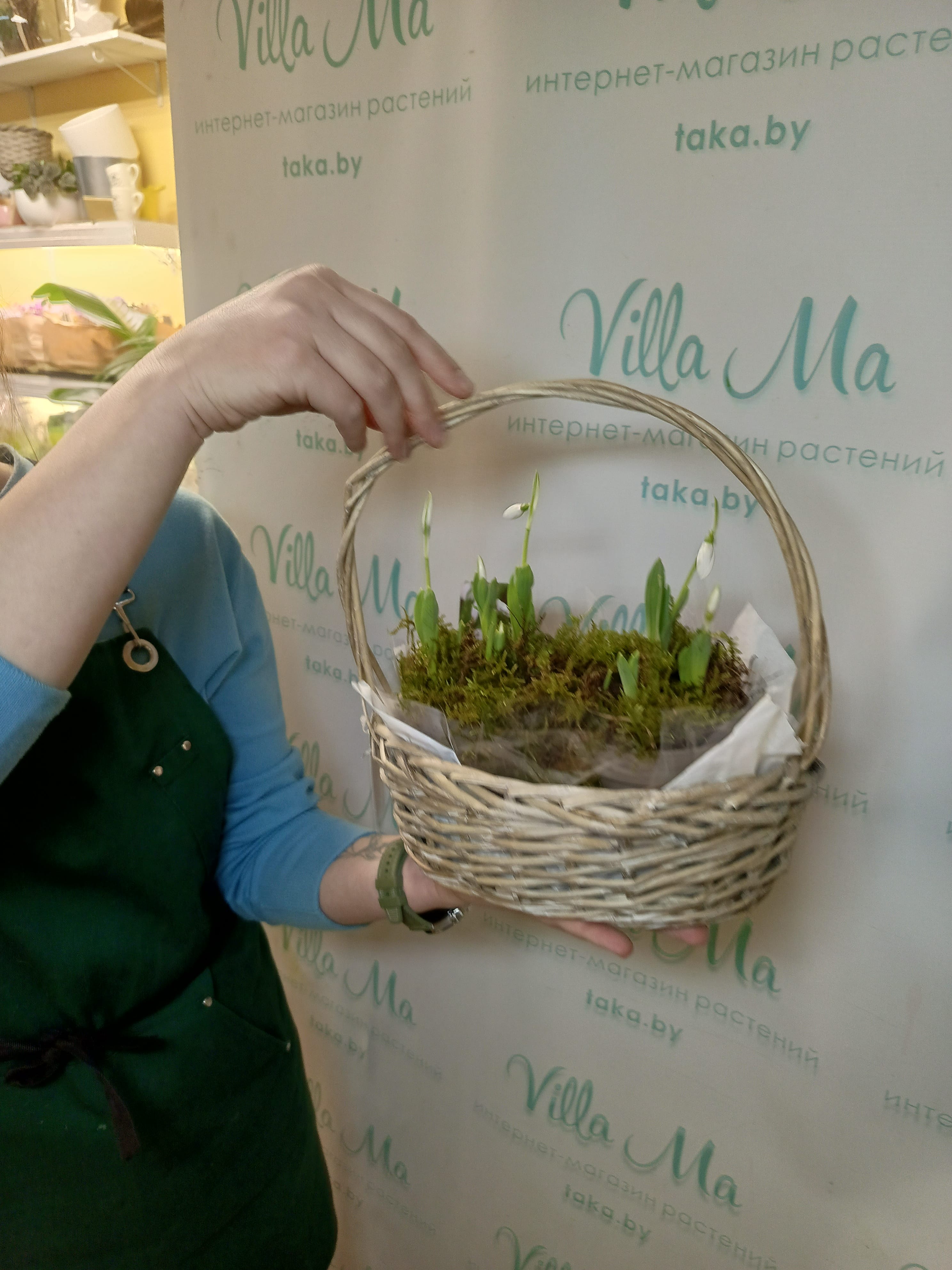 Подснежники в корзинке - живой букет из цветущих подснежников во флористической корзине.