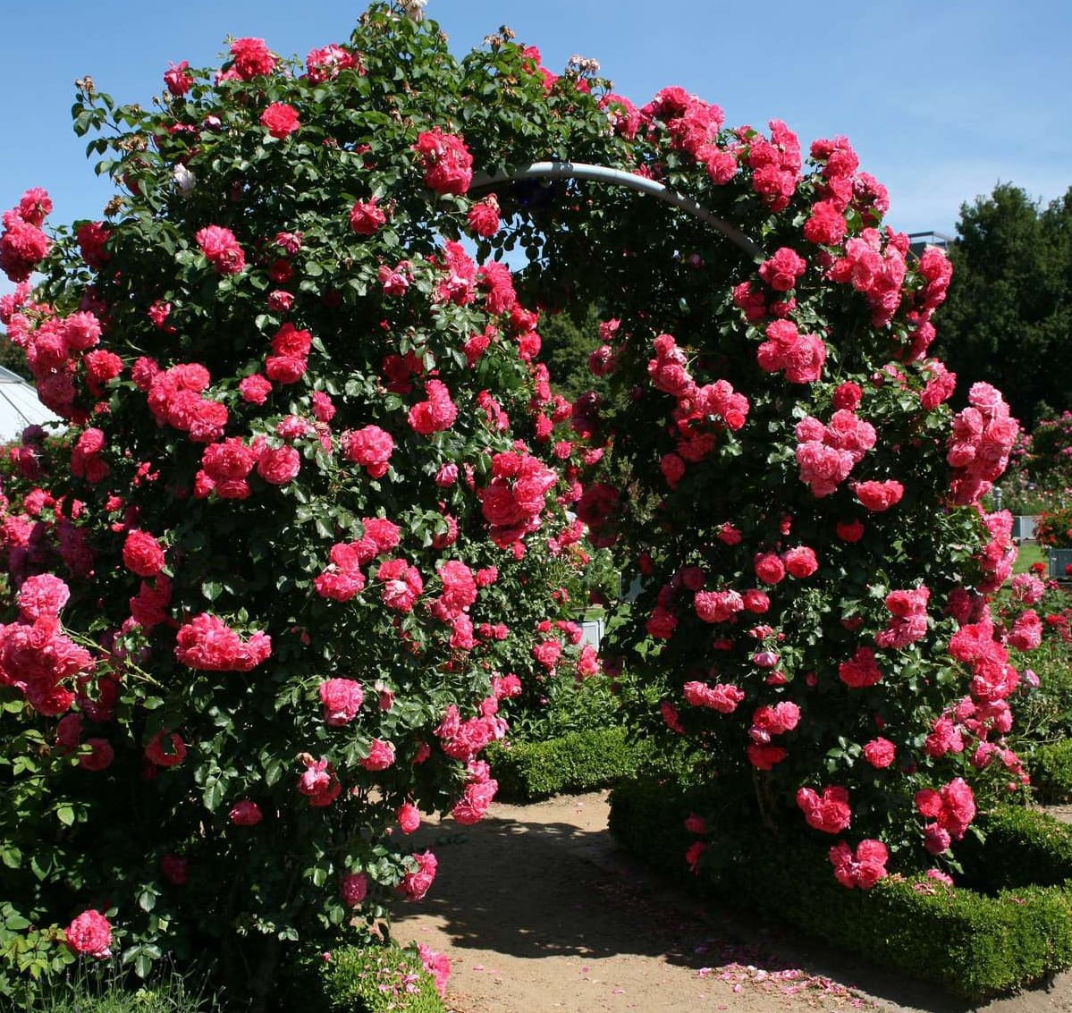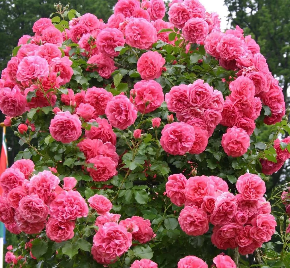 Цветущая плетистая роза Розариум Ютерсен вызывает восхищение. Кусты обильно усыпаны крупными алыми цветами с розовым отливом, которые распускаются на побегах прошлого и текущего года.
