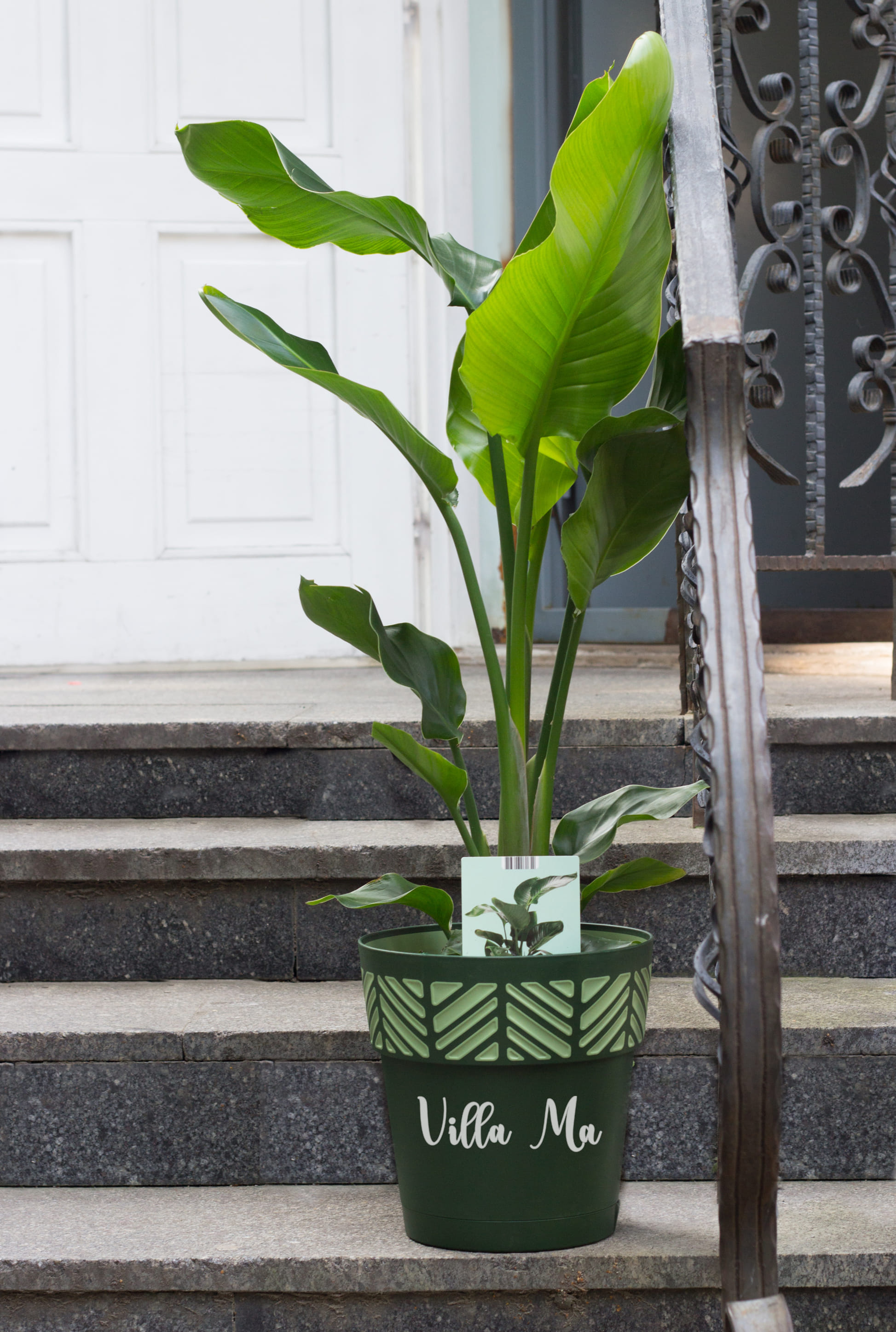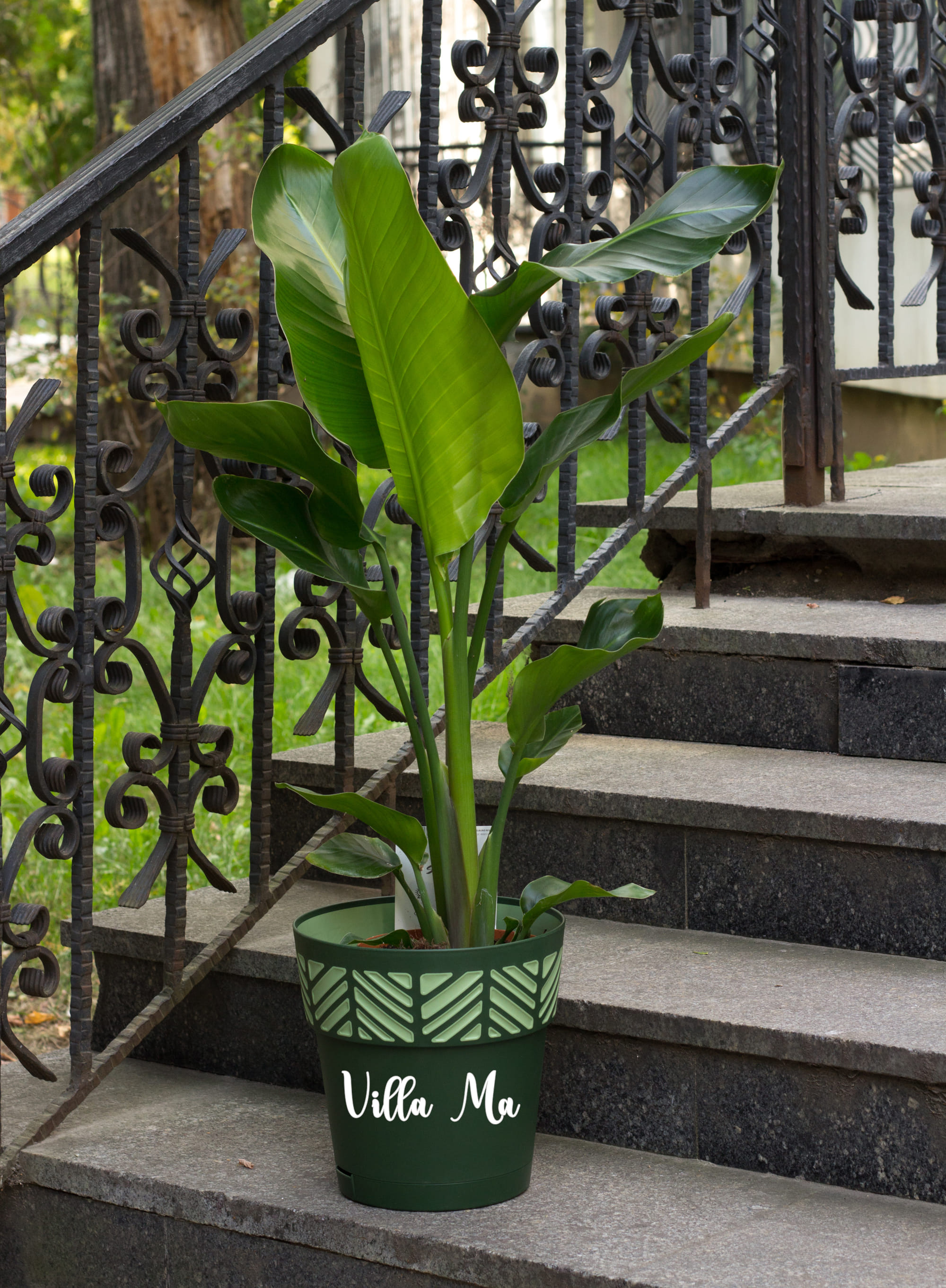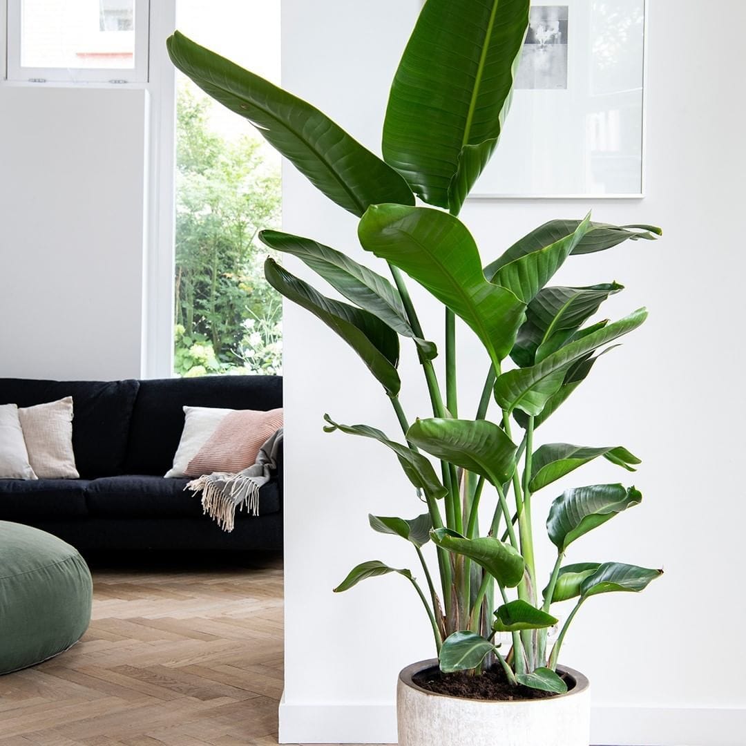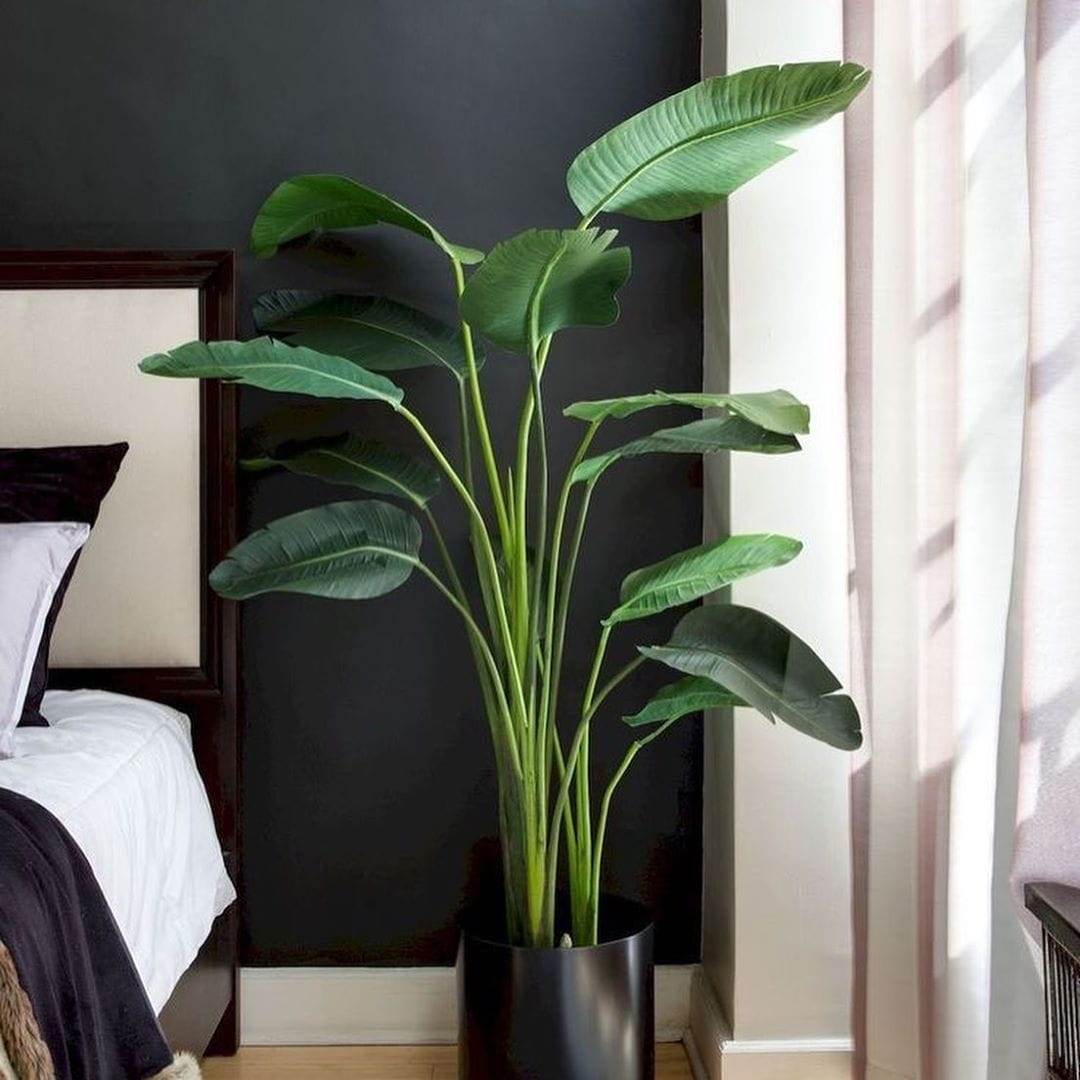 популярное большое комнатное неприхотливое растение в горшке с крупными листьями, банановая пальма.