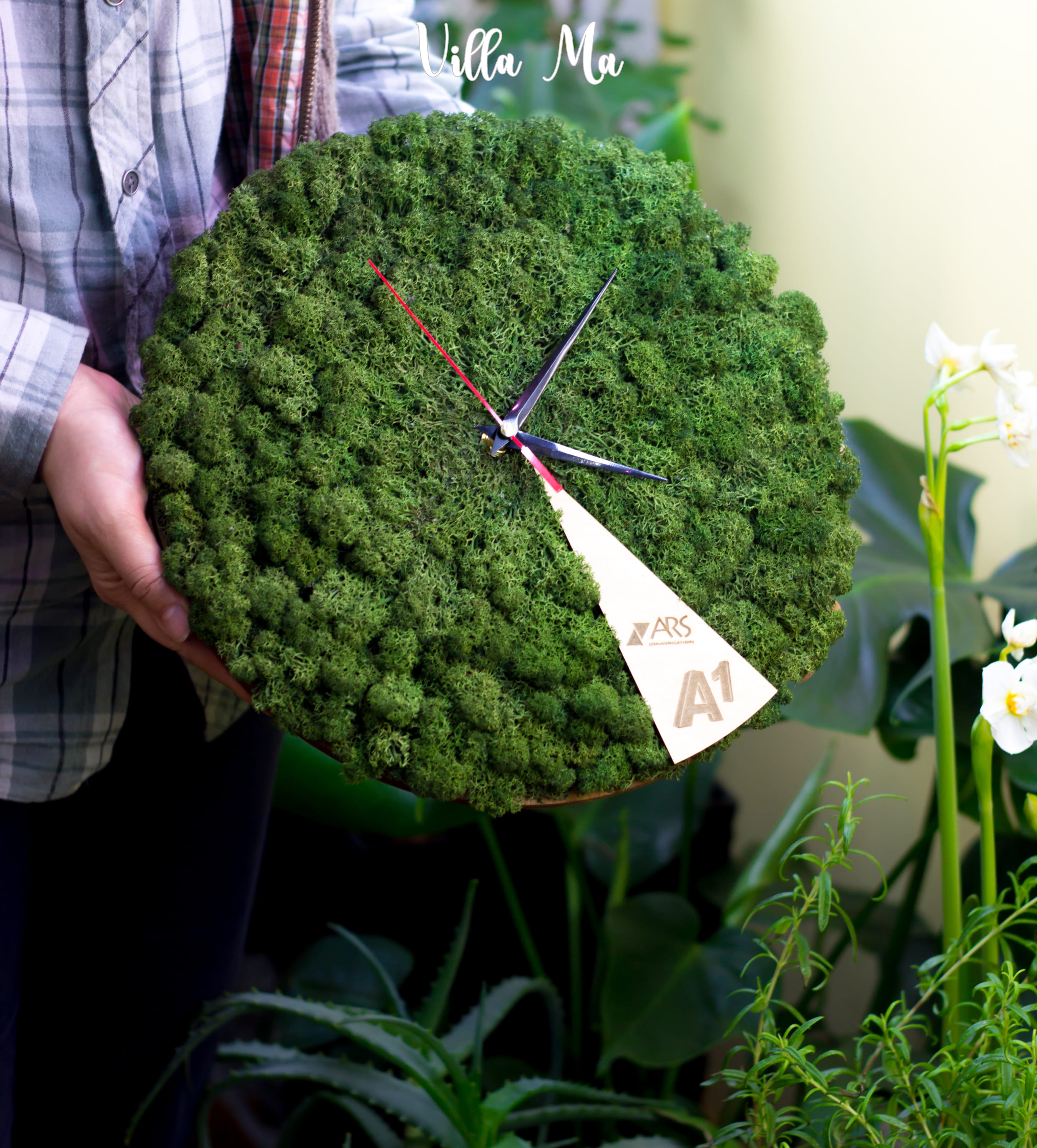 Часы интерьерные из мха и круглые панно - изготовим для Вас настоящие часы, декорированные вечным мхом и дополнениями по индивидуальному заказу (логотип, фигурные стрелки, надписи) любого диаметра.