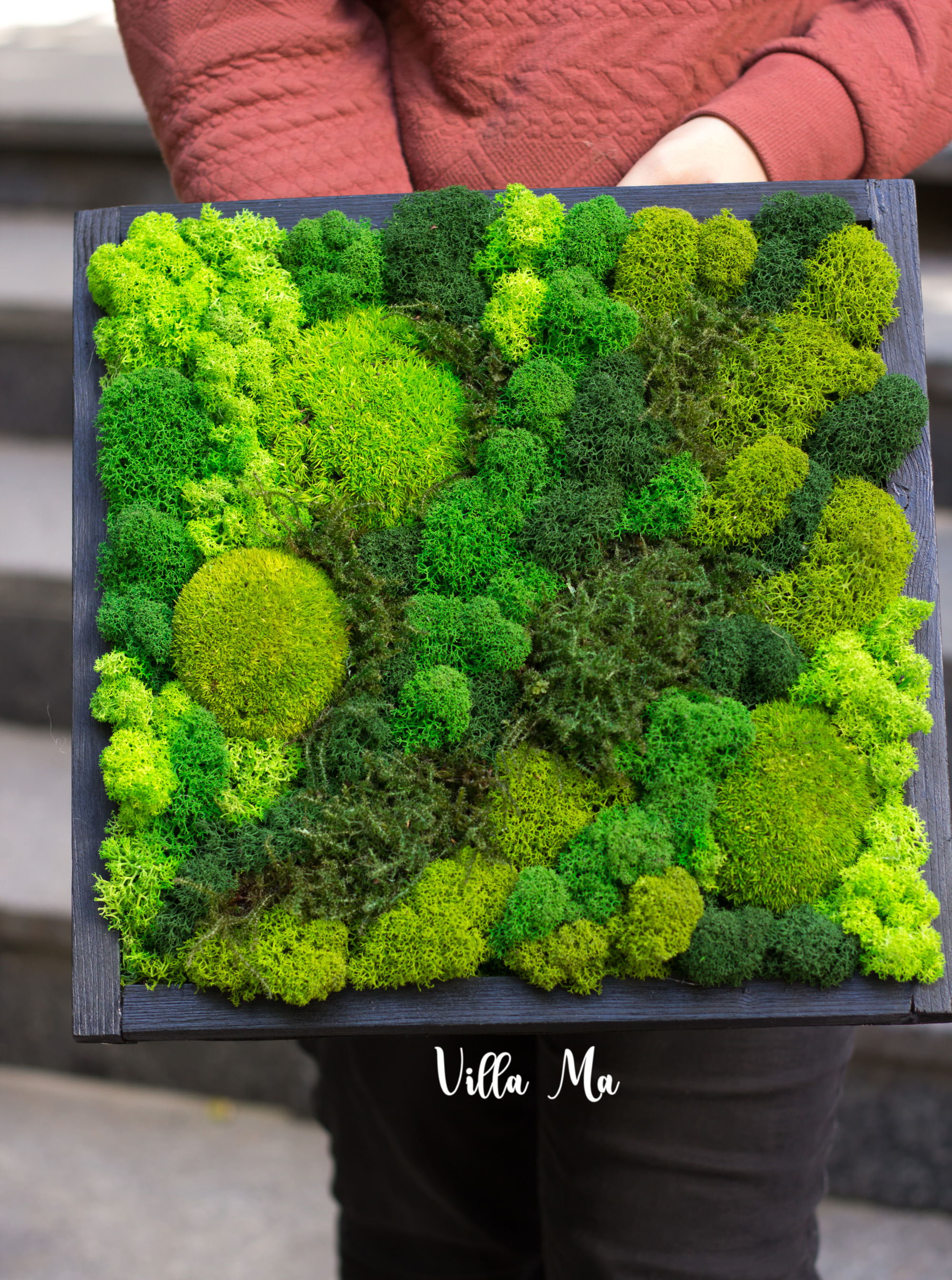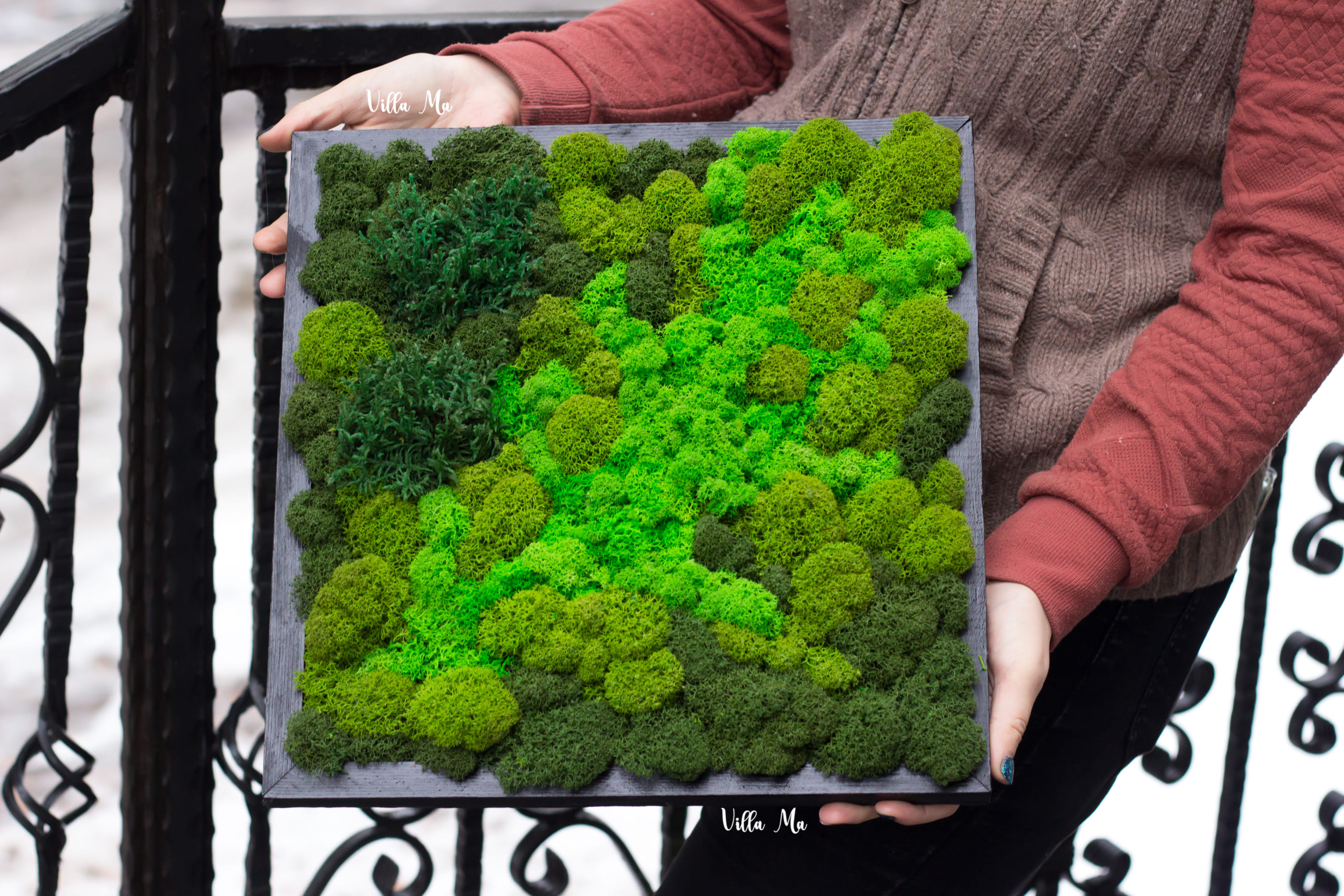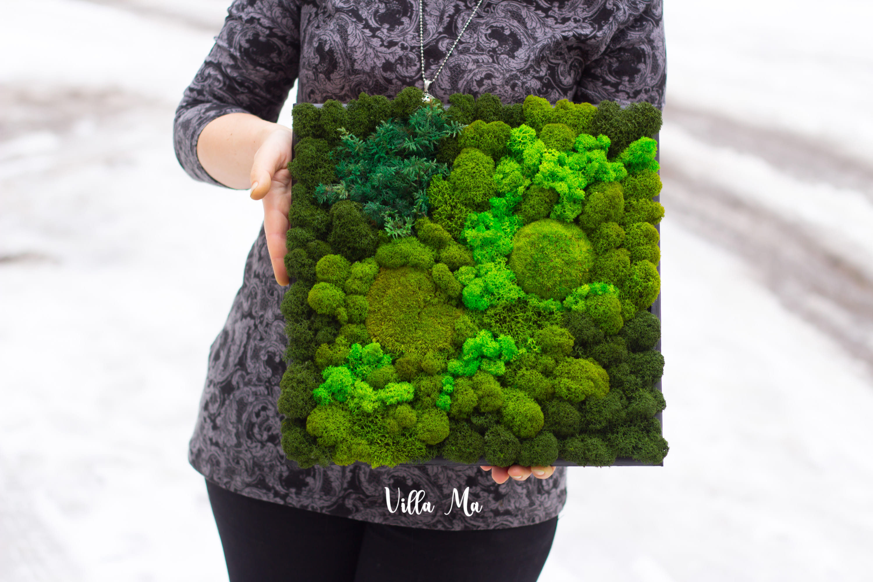 Для панно используется стабилизированный натуральный мох, который обработан по специальной технологии, позволяющей ему сохранять свою мягкость, упругость, цвет, аромат на долгие годы. Основа этой картины из стабилизированного мха - плотная фанера или картон флористический.