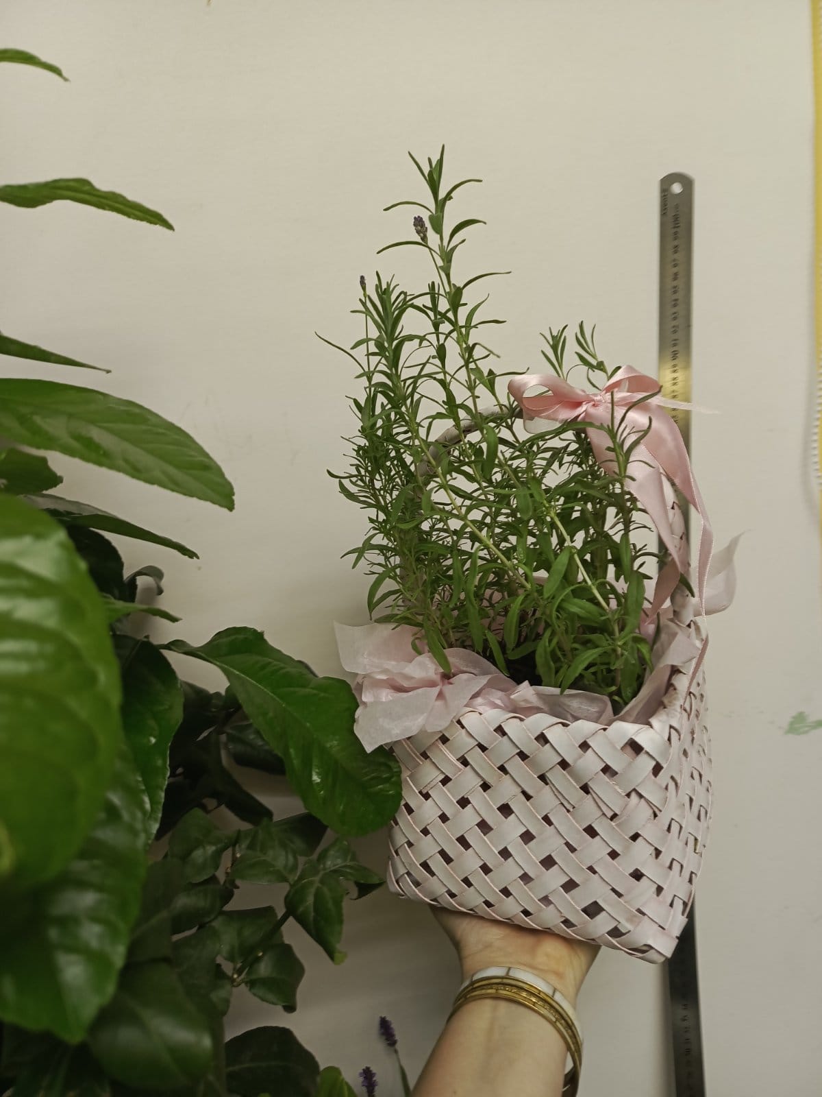 Подарочная композиция в корзине из живого растения с оформлением, или композиции из живых растений оформленные к празднику с поздравительной открыткой.